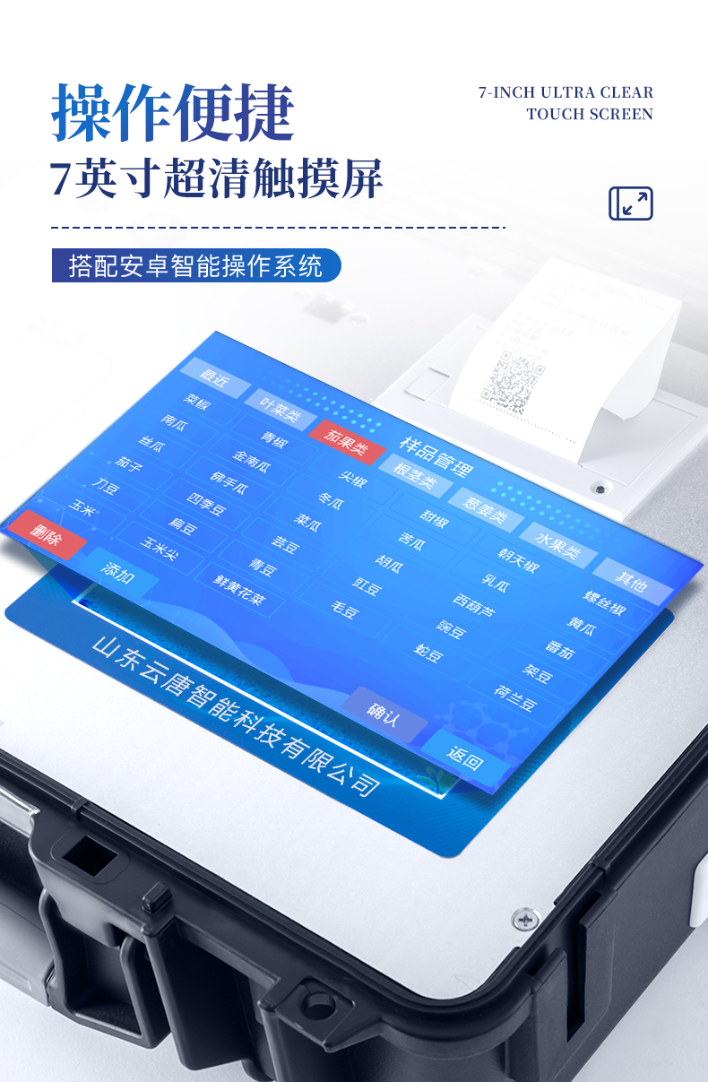 顯示方式:≥5英寸液晶觸摸屏顯示,人性化中文操作界面,讀數(shù)直觀、簡(jiǎn)單。配備嵌入式高速熱敏打印機(jī),可選擇手動(dòng)打印或者自動(dòng)打印,三分鐘出打印結(jié)果。光源采用進(jìn)口超高亮發(fā)光二極管,具有低功耗、穩(wěn)定性強(qiáng)、高靈敏度,高檢測(cè)精度,高重復(fù)性精度,光源可控、響應(yīng)速度快等優(yōu)點(diǎn)。采用標(biāo)準(zhǔn)USB接口設(shè)計(jì),免驅(qū)動(dòng)安裝,方便數(shù)據(jù)的存貯和移動(dòng),并可隨時(shí)與計(jì)算機(jī)直接相連,并且可用計(jì)算機(jī)控制儀器。實(shí)現(xiàn)數(shù)據(jù)查詢、瀏覽、分析、統(tǒng)計(jì)、打印等。智能化程度高,儀器具有自檢功能:具有開(kāi)機(jī)自檢和調(diào)零功能,具有自動(dòng)檢測(cè)重復(fù)性功能內(nèi)置強(qiáng)大的數(shù)據(jù)庫(kù),可在儀器上直接選擇樣品名稱(chēng)、檢測(cè)指標(biāo)、送檢單位等信息,也可在儀器上直接編輯錄入樣品名稱(chēng)、檢測(cè)指標(biāo)、送檢單位等信息并保存進(jìn)樣品數(shù)據(jù)庫(kù)。支持Wifi網(wǎng)絡(luò),數(shù)據(jù)可局域網(wǎng)和互聯(lián)網(wǎng)數(shù)據(jù)上傳,檢測(cè)結(jié)果直接傳至食品安全監(jiān)管平臺(tái)。進(jìn)行區(qū)域食品安全監(jiān)管及大數(shù)據(jù)分析處理,檢測(cè)區(qū)域食品安全長(zhǎng)短期動(dòng)態(tài),達(dá)到食品安全問(wèn)題預(yù)估、預(yù)警