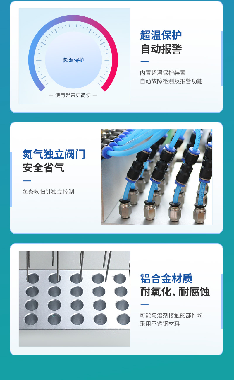 每個吹針都可以獨立控制,避免引起交叉污染。儀器氣腔高度可以自行調(diào)節(jié),配備標準氣針長度為15厘米。氮吹儀有36個氣道控制開關(guān),節(jié)約氣體,每根吹氣針的位置可獨立改變吹掃位置,使之適用不同的樣品容器及不同的樣品位置在濃縮有毒溶劑時,整個系統(tǒng)可置于通風(fēng)柜中,降低危險。內(nèi)置超溫保護裝置,自動故障檢測及報警功能,方便實用。儀器有LED顯示屏,溫度同步顯示、時間遞減顯示,可時時觀察溫度變化。具有整體溫度更均勻,加熱速度快本產(chǎn)品還可以作為普通的干式恒溫器使用使用起來更簡便,而且溫度也可以達到150℃,可以更好濃縮樣品