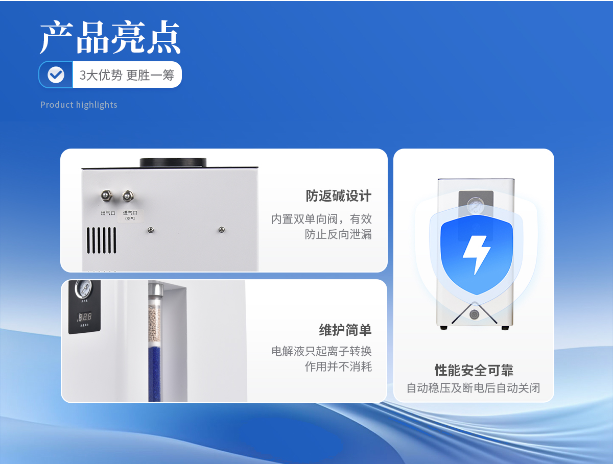 1、可取代高壓氮氣瓶,使實驗室儀器化。 2、操作簡便,只需啟動電源開關(guān),儀器即可產(chǎn)氮且輸出壓力穩(wěn)定。 3、不消耗電解液;電解液只起離子轉(zhuǎn)換作用并不消耗,所以只需補充因蒸發(fā)而損失的少量蒸餾水。 4、產(chǎn)氣純度高,空氣經(jīng)電解池分離后即可得到高純氮氣。 5、性能安全可靠:具有穩(wěn)壓和斷電后自動關(guān)閉氣路功能。 6、壽命長,既可間斷使用,又可連續(xù)使用且產(chǎn)氣量穩(wěn)定、不衰減。 7、**節(jié)能:采用**的開關(guān)電源,提高了電解效率。 8、配有雙單向閥,自動防返堿。