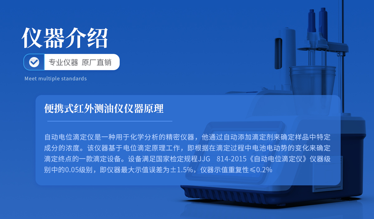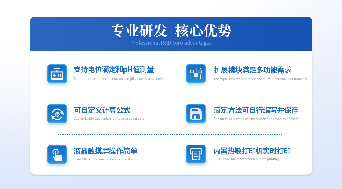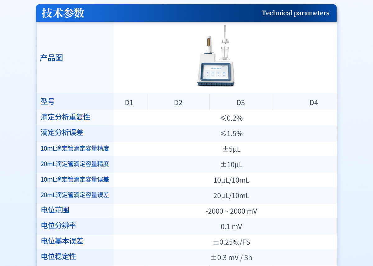 自動電位滴定儀是一種用于化學(xué)分析的精密儀器,他通過自動添加滴定劑來確定樣品中特定成分的濃度。該儀器基于電位滴定原理工作,即根據(jù)在滴定過程中電池電動勢的變化來確定滴定終點的一款滴定設(shè)備。設(shè)備滿足國家檢定規(guī)程JJG 814-2015《自動電位滴定儀》儀器級別中的0.05級別,即儀器**示值誤差為±1.5%,儀器示值重復(fù)性≤0.2%