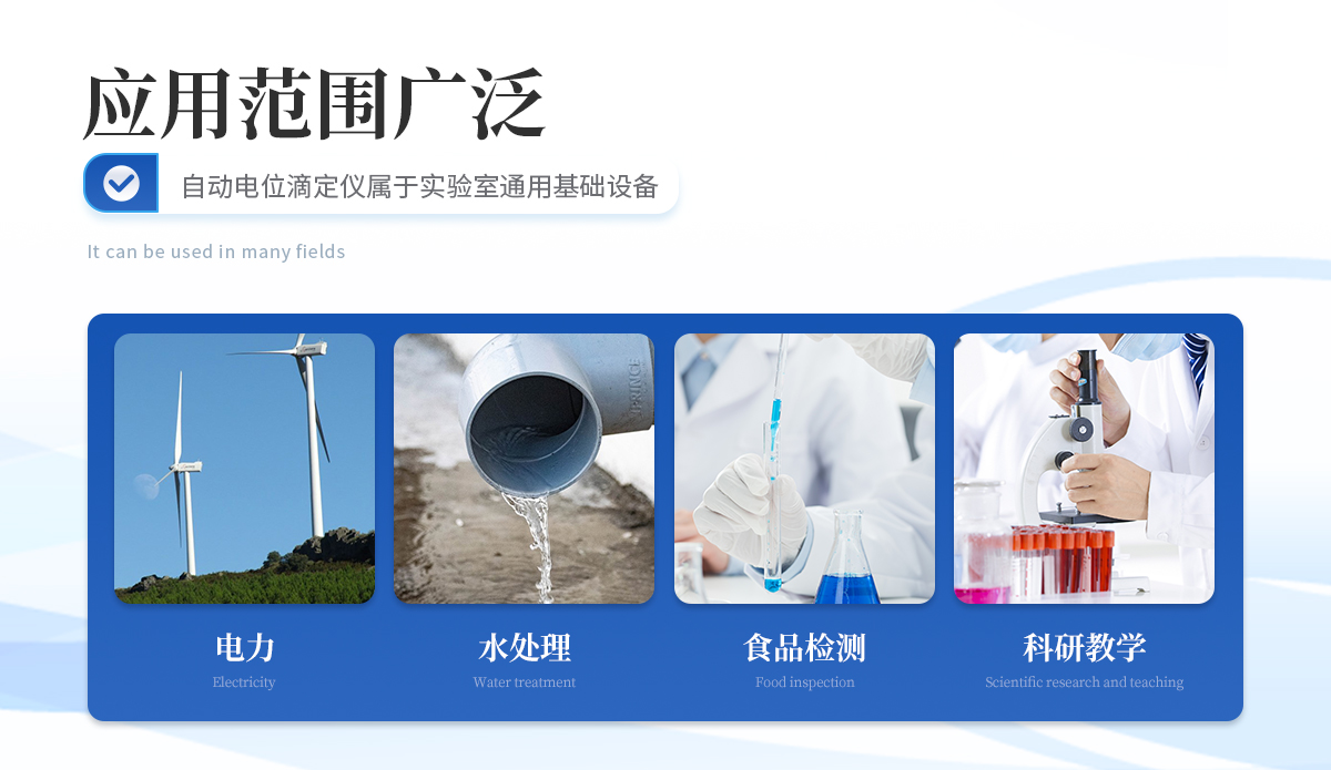 自動電位滴定儀屬于實驗室通用基礎(chǔ)設(shè)備,使用非常廣泛,可應(yīng)用在食品、藥檢、疾控、商檢、水處理、石油、化工、海洋、電力、環(huán)保、新能源、教學(xué)、科研等相關(guān)領(lǐng)域。
