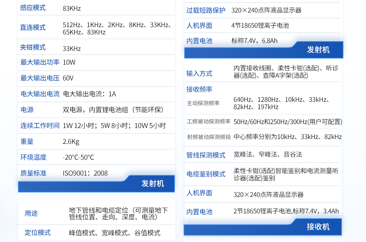 | 1.發(fā)射機: 功能:對管線施加特定頻率的定位信號 輸出模式:感應模式、直連模式、夾鉗模式 定位頻率:5Hz 工作頻率:512Hz、1KHz、33KHz、83KHz 不同模式的頻率配置: 感應模式:83KHz 直連模式:512Hz、1KHz、33KHz、83KHz 夾鉗模式:33KHz **輸出功率:10W **輸出電壓:60V 電大輸出電流:1A 電源:雙電源,內置鋰電池組(節(jié)能環(huán)保) 連續(xù)工作時間:1W 12小時;5W 8小時;10W 5小時。 重量:2.6Kg 環(huán)境溫度:-20℃-50℃ 質量標準:ISO9001:2008 | 2.接收機: 用途:地下管線和電纜定位(可測量地下管線位置、走向、深度、電流) 定位模式: 峰值模式:使用兩個水平線圈 寬峰模式:使用一個水平線圈 谷值模式:使用一個垂直線圈,具有左右導向功能 接收頻率:50Hz、512Hz、1KHz、33KHz、83KHz。 增益控制:自動增益,增益范圍0-100dB 定位精度:深度的±5%; 深度測量精度:深度的±5%(無鄰近管線干擾) 電流測量精度:實際電流的±5% 定位深度:6m 電源:內置鋰電池組(節(jié)能環(huán)保) 工作時間:平均工作時間8小時 重量:2.3Kg 環(huán)境溫度:-20℃-50℃ |