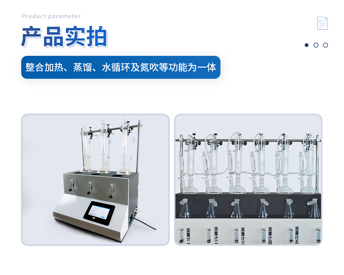 主要原理是根據(jù)藥典中所提供的檢測方法,將中藥材以蒸餾法進行處理,樣品中的亞硫酸鹽系列物質(zhì)加酸處理后轉(zhuǎn)化為二氧化硫后,隨氮氣流帶入到含有雙氧水的吸收瓶中,雙氧水將其氧化為硫酸根離子,采用酸堿滴定法測定,計算藥材及飲片中的二氧化硫殘留量。本產(chǎn)品在嚴格遵循藥典要求的基礎(chǔ)上,整合加熱,蒸餾,水循環(huán)及氮吹等功能為一體,可同時提供3-5個樣品(空白樣,平行樣)的處理,從而極大的提高了檢測數(shù)據(jù)的精度和減少了工作時間。