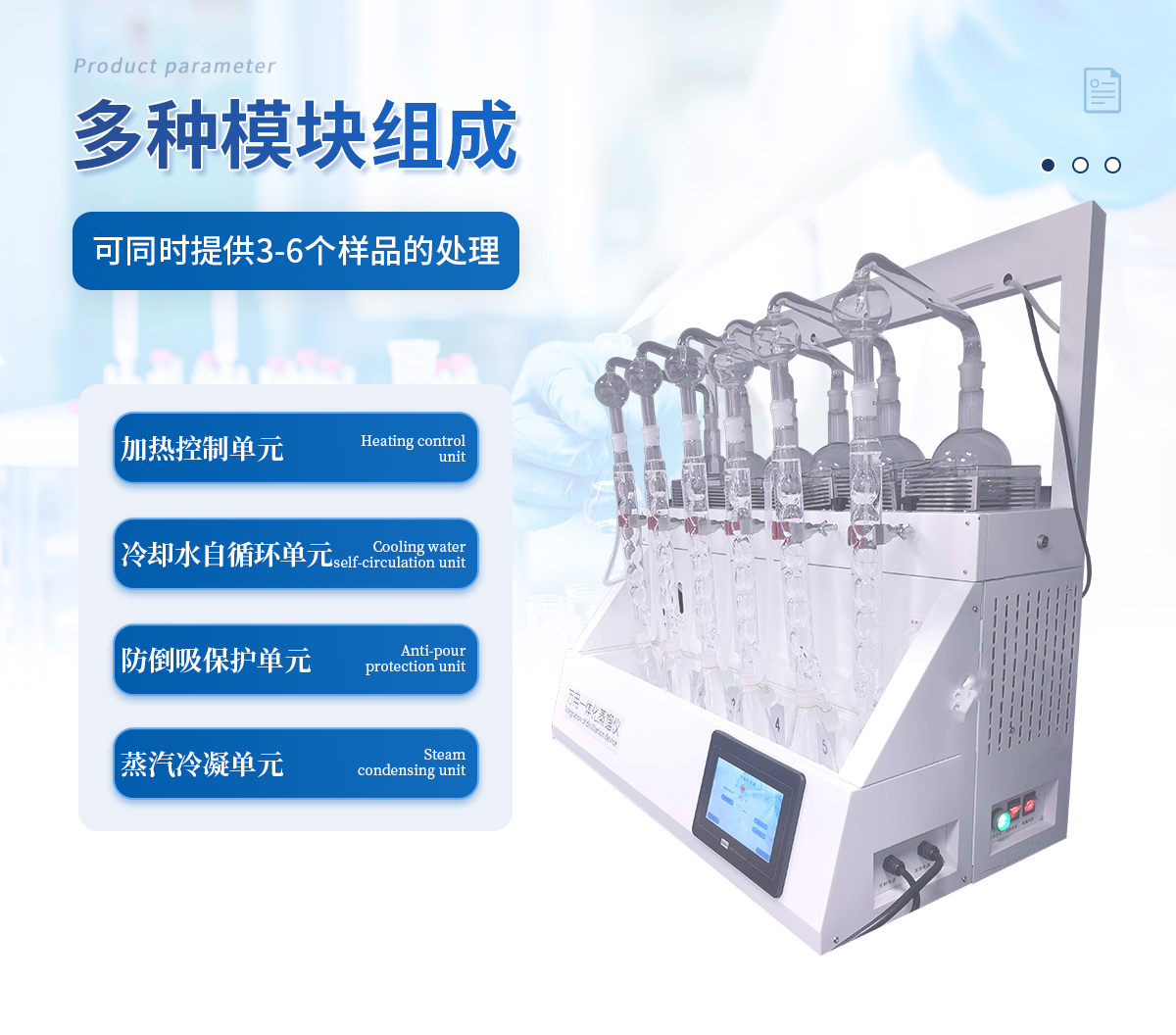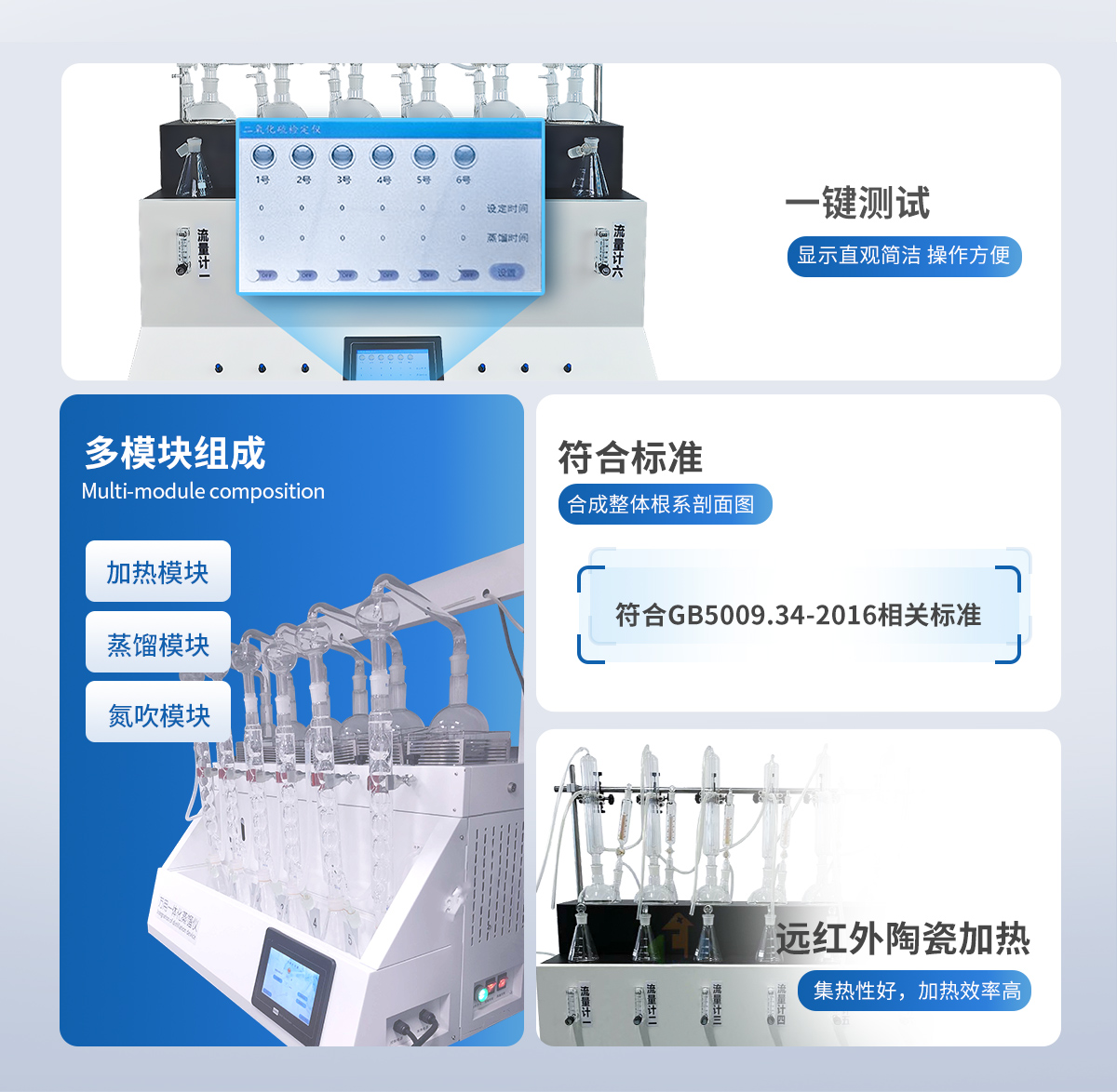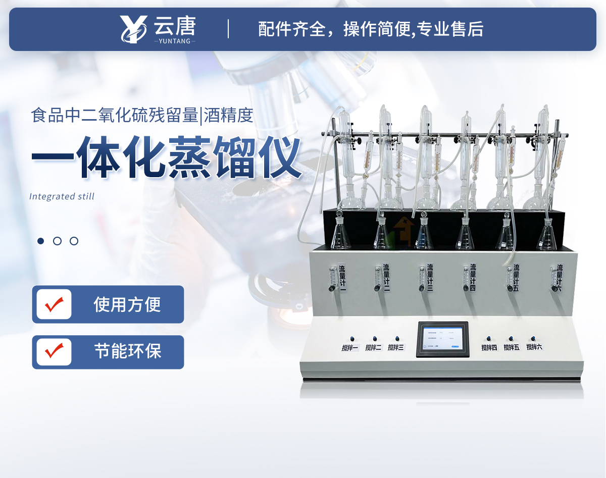 主要原理是根據(jù)藥典中所提供的檢測方法,將中藥材以蒸餾法進(jìn)行處理,樣品中的亞硫酸鹽系列物質(zhì)加酸處理后轉(zhuǎn)化為二氧化硫后,隨氮?dú)饬鲙氲胶须p氧水的吸收瓶中,雙氧水將其氧化為硫酸根離子,采用酸堿滴定法測定,計(jì)算藥材及飲片中的二氧化硫殘留量。本產(chǎn)品在嚴(yán)格遵循藥典要求的基礎(chǔ)上,整合加熱,蒸餾,水循環(huán)及氮吹等功能為一體,可同時提供3-6個樣品(空白樣,平行樣)的處理,從而極大的提高了檢測數(shù)據(jù)的精度和減少了工作時間。