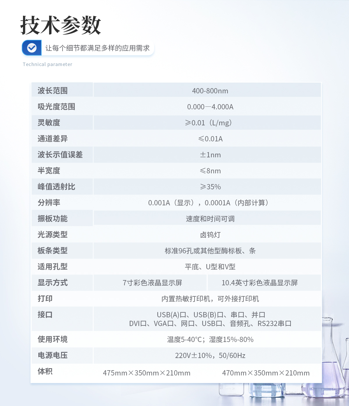 波長(zhǎng)范圍: 400-800nm*濾光片配置:10個(gè)濾光片位置,標(biāo)配405nm、450nm、492nm、630nm,選配6定制波長(zhǎng)吸光度范圍:0.000―4.000A*光通道數(shù):8通道光路檢測(cè),另設(shè)一個(gè)獨(dú)立參比通道*示值穩(wěn)定性:≤±0.002A或≤0.5%T/10min。*示值誤差(準(zhǔn)確性):≤±0.005A或±0.2%T*重復(fù)性:≤0.2%或≤0.2%T。靈敏度:≥0.01(L/mg)。通道差異:≤0.01A。波長(zhǎng)示值誤差:±1nm半寬度:≤8nm峰值透射比:≥35%分辨率:0.001A(顯示),0.0001A(內(nèi)部計(jì)算)*讀板速度:?jiǎn)尾ㄩL(zhǎng)≤3秒/96孔,雙波長(zhǎng)≤6秒/96孔振板功能:速度和時(shí)間可調(diào)光源類(lèi)型:鹵鎢燈板條類(lèi)型:標(biāo)準(zhǔn)96孔或其他型酶標(biāo)板、條適用孔型:平底、U型和V型*顯示方式:10.4英寸彩色液晶顯示屏顯示輸入方式:觸摸屏輸入,可選配鼠標(biāo)和鍵盤(pán)打?。簝?nèi)置熱敏打印機(jī),可外接打印機(jī)接  口:DVI口、VGA口、網(wǎng)口、USB口、音頻孔、RS232串口使用環(huán)境:溫度5-40℃;濕度15%-80%電源電壓:220V±10%,50/60Hz體積:470mm×350mm×210mm(長(zhǎng)×寬×高)重量:11.5Kg