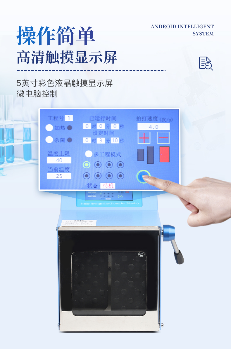 ●5英寸液晶顯示屏。    ●可儲存三組工作程序。    ●可調(diào)整的均質(zhì)時間。    ●均質(zhì)速度可調(diào)節(jié)或固定。    ●拍擊器可調(diào)整前后距離。    ●無菌一次性濾袋,保證衛(wèi)生。    ●全開啟式門,易于清洗。    ●玻璃透明窗口易于觀察 。    ●樣品與均質(zhì)儀無接觸,如無樣品泄露則不需進行系統(tǒng)清洗.    ●均質(zhì)柔和、樣品零污染、無損傷、不升溫、不需要滅菌處理,不需洗刷器皿。