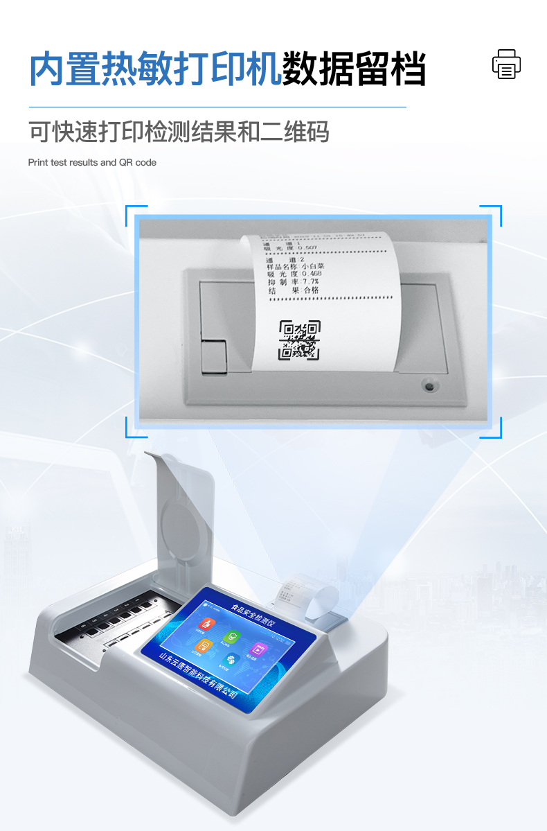 | 安卓智能操作系統(tǒng),采用更加**和人性化操作,儀器具有網(wǎng)線連接、wifi聯(lián)網(wǎng)上傳、GPRS無線遠傳功能,快速上傳數(shù)據(jù)。 | 智能化程度高,儀器具有自檢功能:具有開機自檢和調(diào)零功能,具有自動檢測重復性功能。 | 檢測通道:≥12個檢測通道,可以同時測試多個樣品,每個樣品由程序控制分別獨立工作,不會互相干擾。 | 顯示方式:≥8英寸液晶觸摸屏顯示,人性化中文操作界面,讀數(shù)直觀、簡單。 | 配備新一代嵌入式熱敏打印機,可選擇手動打印或者自動打印,檢測完成可自動打印檢測報告和二維碼。 | 光源采用進口超高亮發(fā)光二極管,高精度、穩(wěn)定性強、光源可控、可以關(guān)掉不使用的光源,功耗更低。 | 采用USB2.0接口設(shè)計,方便數(shù)據(jù)的存貯和移動,并可隨時與計算機直接相連,并且可用計算機控制儀器。實現(xiàn)數(shù)據(jù)查詢、瀏覽、分析、統(tǒng)計、打印等。 | 儀器帶有監(jiān)管平臺。數(shù)據(jù)可局域網(wǎng)和互聯(lián)網(wǎng)數(shù)據(jù)上傳,檢測結(jié)果直接傳至食品安全監(jiān)管平臺。進行區(qū)域食品安全監(jiān)管及大數(shù)據(jù)分析處理,檢測區(qū)域食品安全長短期動態(tài),達到食品安全問題預估、預警 | 一體化便攜式快檢設(shè)備,滿足現(xiàn)場及流動檢測使用需求,能夠在同一軟件下實現(xiàn)所有檢測項目的檢測,并可通過同一窗口直觀顯示檢測結(jié)果。 | 儀器具有多品類多種類樣品菜單庫,可靈活選擇檢測樣品,不同的檢測通道可同時檢測不同的樣品項目。也可在儀器上直接編輯錄入樣品名稱、檢測指標、送檢單位等信息并保存進樣品數(shù)據(jù)庫。 | 樣品處理簡單省力,整體操作快速、安全、便捷。 | 儀器具有自身保護功能,可設(shè)置用戶名及密碼,防止非工作人員操作等。 | 高靈敏度,高檢測精度,高重復性精度,掃描式高精度光學傳感器。 | 儀器具有重新校準、鎖定、恢復出廠設(shè)置功能。 | 支持U盤存儲。 結(jié)果判定線可修改,對照值標定值可保存,斷電不丟失數(shù)據(jù)。 |