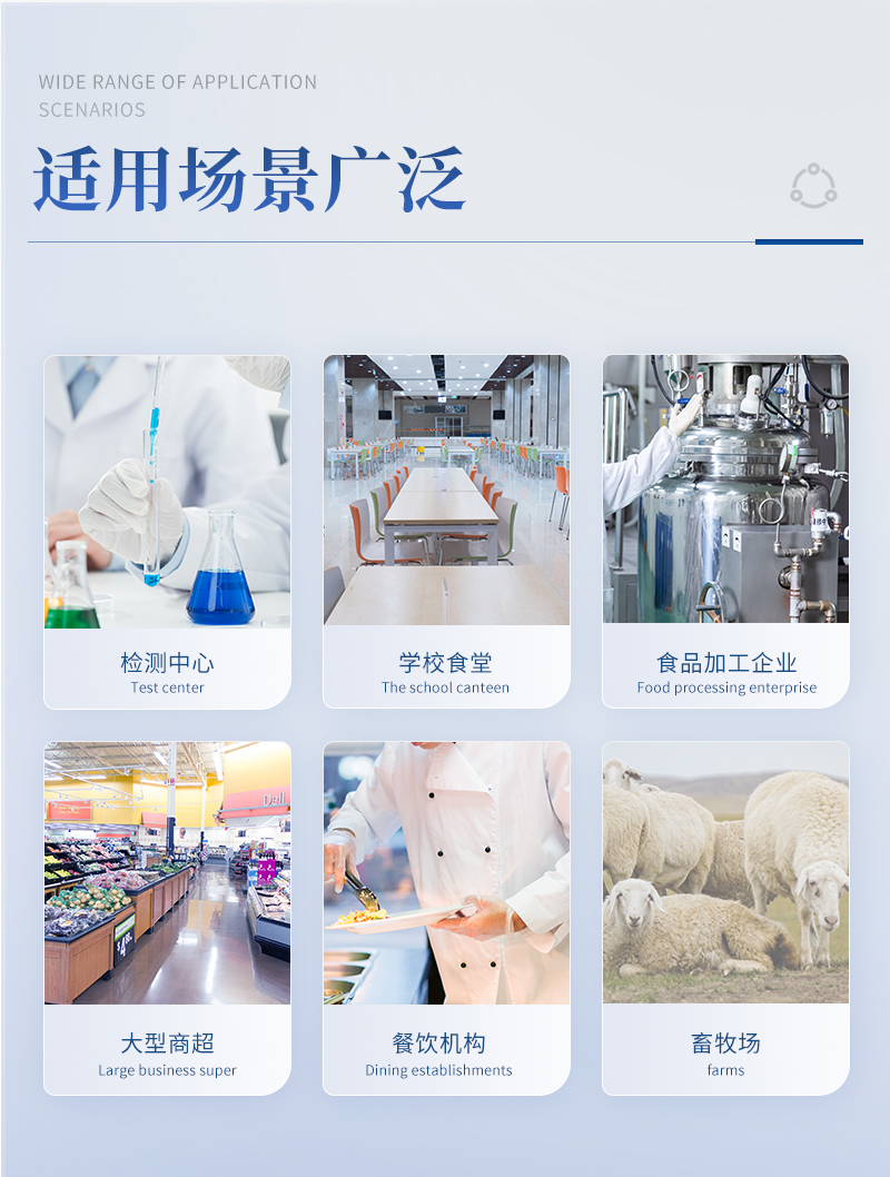 果蔬中:農(nóng)藥殘留 病害肉診斷:組胺、揮發(fā)性鹽基氮抗生素殘留(獸藥):四環(huán)素類、硝基呋喃類、磺胺類、β-興奮劑類、沙星類、磺胺類、喹諾酮類,甲砜霉素,氟苯尼考,金剛烷胺、替米考星、慶大霉素、林可霉素、鏈霉素、恩諾沙星、環(huán)丙沙星、頭孢啦啶、青霉素、阿莫西林等水產(chǎn)品安全類:孔雀石綠、氯霉素、呋喃妥因、呋喃西林、呋喃它酮、呋喃唑酮等 瘦肉精激素(獸藥):鹽酸克倫特羅、沙丁胺醇、萊克多巴胺、己烯雌酚等 蛋類藥物殘留類:氯霉素,四環(huán)素,磺胺類,喹諾酮類,呋喃西林,呋喃它酮,呋喃妥因,呋喃唑酮,氟苯尼考,阿莫西林、頭孢氨芐、紅霉素、鏈霉素等真菌毒素殘留:食用油、糧食及飼料中黃曲霉毒素B1、黃曲霉毒素總量,奶中黃曲霉毒素M1、嘔吐毒素、玉米赤霉烯酮、赭曲霉毒素A、T2毒素、伏馬毒素等動(dòng)物疫病類:禽流感、新城疫、牛羊口蹄疫、牛羊結(jié)核病、牛羊包蟲、牛羊布病、小反芻獸、豬藍(lán)耳病毒、豬瘟病毒、豬偽狂犬病毒、豬細(xì)小、豬圓環(huán)、犬細(xì)小病毒、犬瘟熱病毒、犬狂犬病毒等