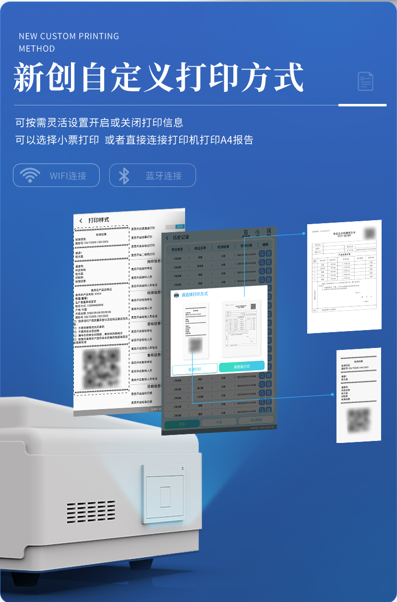 9.7.1、全新打印系統(tǒng):內(nèi)置全新打印機(jī),新創(chuàng)自定義打印方式,可按需靈活勾選控制:產(chǎn)品合格證(國(guó)家農(nóng)業(yè)部標(biāo)準(zhǔn)要求),二維碼,抽樣信息、檢測(cè)信息,受檢信息、復(fù)核信息、抽樣日期、檢測(cè)日期等信息的打印。