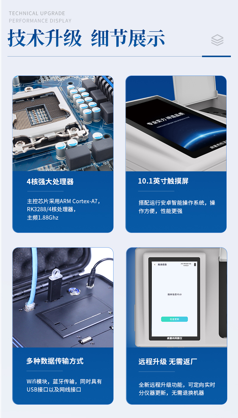 儀器采用手提箱一體化設(shè)計(jì),將分光光度模塊、膠體金檢測(cè)模塊、新型農(nóng)殘檢測(cè)模塊、數(shù)字化管理模塊、無(wú)線通訊模塊高度集成于一體,同時(shí)預(yù)留升級(jí)檢測(cè)方法,可遠(yuǎn)程進(jìn)行升級(jí)系統(tǒng)。儀器檢測(cè)模塊標(biāo)準(zhǔn)化、智能化,可隨意自由組合。檢測(cè)箱體內(nèi)置多個(gè)標(biāo)準(zhǔn)檢測(cè)單元,檢測(cè)模塊可以調(diào)整配置。顯示屏幕:儀器采用10.1英寸豎向液晶觸摸屏顯,搭配運(yùn)行安卓智能操作系統(tǒng),主控芯片采用ARM Cortex-A7,RK3288/4核處理器,主頻1.88Ghz,操作方便,性能更強(qiáng)。檢測(cè)通道:≥12通道;采用精密旋轉(zhuǎn)比色池設(shè)計(jì),使用同芯片同光源校準(zhǔn)精度,解決不同光源之間的誤差值,更加準(zhǔn)確**。(1-12通道間誤差0.1%,***:**202022821055.2)儀器光源:高精度進(jìn)口四波長(zhǎng)冷光源,每個(gè)通道均配置 410、520、590、630nm 波長(zhǎng)光源,標(biāo)配**的光路切換裝置,專利光路切換功能可實(shí)現(xiàn)64波長(zhǎng),并且所有檢測(cè)項(xiàng)目可實(shí)現(xiàn)所有通道同時(shí)檢測(cè)。設(shè)備可一鍵校準(zhǔn),自動(dòng)保存校準(zhǔn)數(shù)據(jù),自動(dòng)對(duì)比校驗(yàn),得到精準(zhǔn)光源,采用Android SP存儲(chǔ)數(shù)據(jù),光源數(shù)據(jù)永不丟失,方便每一次使用。通訊接口:配備無(wú)線通信模塊、4G(APN)通訊模塊、藍(lán)牙傳輸,同時(shí)具有雙USB接口以及RJ45網(wǎng)線接口,可以多方式實(shí)現(xiàn)數(shù)據(jù)保存及數(shù)據(jù)傳輸。存儲(chǔ)方式:支持U盤存儲(chǔ),標(biāo)準(zhǔn)USB接口,免驅(qū)動(dòng)安裝。檢測(cè)結(jié)果存儲(chǔ)容量20萬(wàn)條以上,可生成Excel表格進(jìn)行拷貝,并具有登錄保護(hù)功能。智能化操作系統(tǒng):