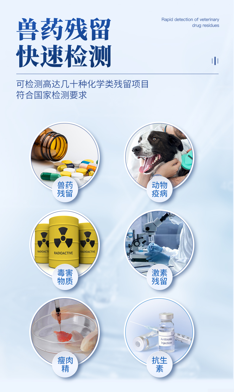 食品添加劑:二氧化硫、雙氧水、亞硝酸鹽、硝酸鹽、苯甲酸鈉、山梨酸鉀、糖精鈉、甜蜜素、木耳硫酸鎂等有毒有害物質(zhì):甲醛、吊白塊、硼砂、過氧化苯甲酰、溴酸鉀、羅丹明B、三聚氰胺、蘇丹紅、工業(yè)堿、尿素、明礬等果蔬:農(nóng)藥殘留(酶抑制率法)病害肉:組胺、揮發(fā)性鹽基氮重金屬含量:鉛、鎘、鉻、汞、砷、錫、鎳、鋁等水產(chǎn)品安全類:孔雀石綠、氯霉素、呋喃妥因、呋喃西林、呋喃它酮、呋喃唑酮等瘦肉精激素類(獸藥):鹽酸克倫特羅、沙丁胺醇、萊克多巴胺、己烯雌酚等抗生素殘留:四環(huán)素類、硝基呋喃類、磺胺類、β-興奮劑類、沙星類、磺胺類、喹諾酮類,甲砜霉素,氟苯尼考,金剛烷胺、替米考星、慶大霉素、林可霉素、鏈霉素、恩諾沙星、環(huán)丙沙星、頭孢啦啶、青霉素、阿莫西林等真菌毒素類:食用油、糧食及飼料中黃曲霉毒素B1、黃曲霉毒素總量,奶中黃曲霉毒素M1、嘔吐毒素、玉米赤霉烯酮、赭曲霉毒素A、T2毒素、伏馬毒素等調(diào)味品成分: 食醋的總酸、醬油的總酸、芝麻油純度、谷氨酸鈉、醬油氨基酸態(tài)氮、食鹽中亞鐵氰化鉀、食鹽中碘等食用色素類:紅色色素(胭脂紅、莧菜紅、莧菜紅)、黃色色素(檸檬黃、日落黃)、藍(lán)色色素(亮藍(lán))等動物疫病類:禽流感、新城疫、牛羊口蹄疫、牛羊結(jié)核病、牛羊包蟲、牛羊布病、小反芻獸、豬藍(lán)耳病毒、豬瘟病毒、豬偽狂犬病毒、豬細(xì)小、豬圓環(huán)、犬細(xì)小病毒、犬瘟熱病毒、犬狂犬病毒等蜂蜜成分:果糖和葡萄糖、蔗糖、淀粉酶、酸度等食用油檢測:過氧化值、酸價等蛋類藥物殘留:氯霉素,四環(huán)素,磺胺類,喹諾酮類,呋喃西林,呋喃它酮,呋喃妥因,呋喃唑酮,氟苯尼考,阿莫西林、頭孢氨芐、紅霉素、鏈霉素等酒類及乳品牛奶中蛋白質(zhì):酒中甲醇、乙醇、乳品及牛奶中蛋白質(zhì)、乳品硫氰酸鈉、三聚氰胺,