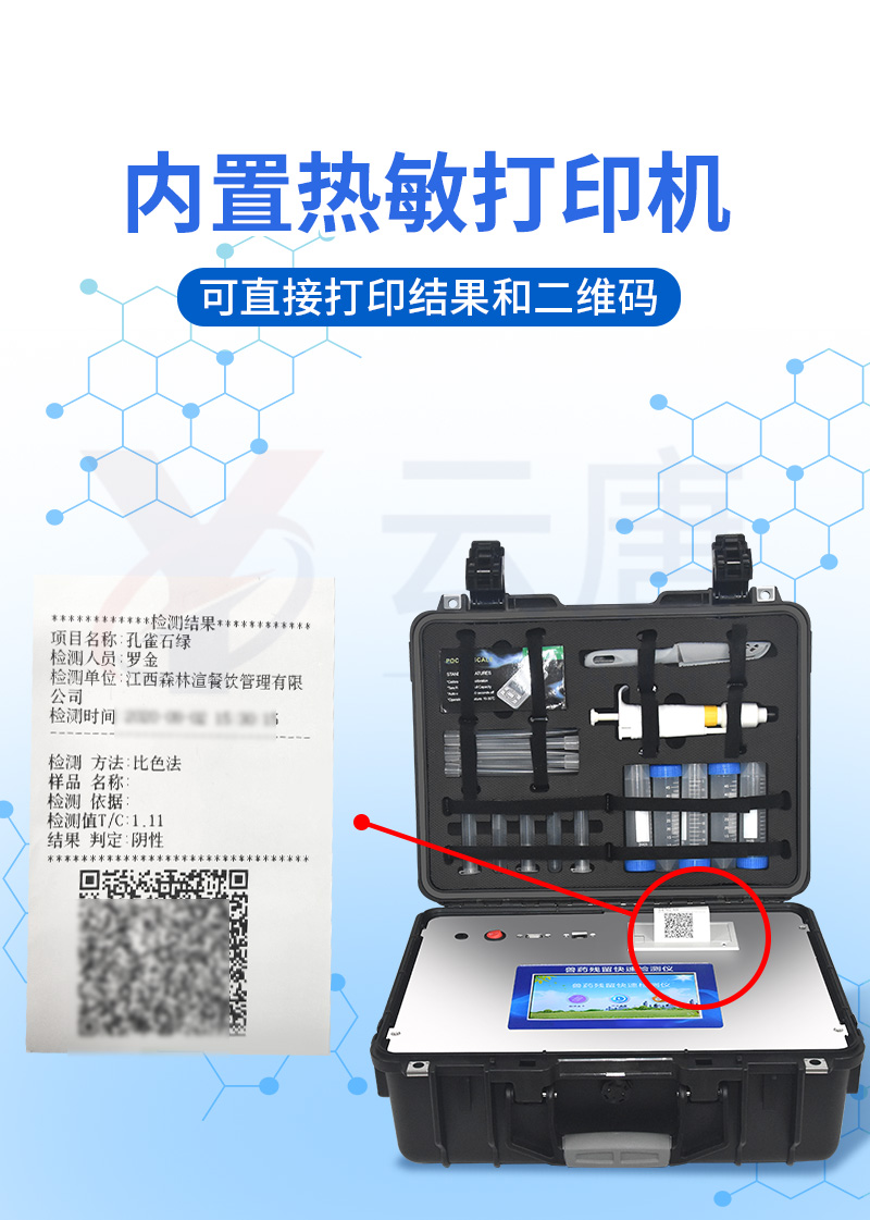 | 安卓智能操作系統(tǒng),采用更加**和人性化操作,儀器具有網(wǎng)線連接、wifi聯(lián)網(wǎng)上傳、4G無線遠傳功能,快速上傳數(shù)據(jù)。 | 智能化程度高,儀器具有自檢功能:具有開機自檢和調(diào)零功能,具有自動檢測重復性功能。 | 新一代高速熱敏打印機,檢測完成可自動打印檢測報告和二維碼。 | 儀器帶有監(jiān)管平臺,數(shù)據(jù)可局域網(wǎng)和互聯(lián)網(wǎng)數(shù)據(jù)上傳,檢測結果直接傳至食品安全監(jiān)管平臺。進行區(qū)域食品安全監(jiān)管及大數(shù)據(jù)分析處理與數(shù)據(jù)統(tǒng)計,檢測區(qū)域食品安全長短期動態(tài),達到食品安全問題預估、預警 | 一體化便攜式快檢設備,滿足現(xiàn)場及流動檢測使用需求,能夠在同一軟件下實現(xiàn)所有檢測項目的檢測,并可通過同一窗口直觀顯示檢測結果。 | 膠體金模塊檢測方式:軌道式自動傳輸掃描,檢測完成后自動退出檢測卡。 | CT線自動識別,無需手動調(diào)整。 | 儀器具有品類多種類樣品菜單庫,可靈活選擇檢測樣品,不同的檢測通道可同時檢測不同的樣品項目。 | 樣品處理簡單省力,整體操作快速、安全、便捷。 | 儀器具有自身保護功能,可設置用戶名及密碼,防止非工作人員操作等。 | 高靈敏度,高檢測精度,高重復性精度,掃描式高精度光學傳感器。 | 內(nèi)置強大的數(shù)據(jù)庫,可在儀器上直接選擇樣品名稱、檢測指標、送檢單位等信息,也可在儀器上直接編輯錄入樣品名稱、檢測指標、送檢單位等信息并保存進樣品數(shù)據(jù)庫。 | 儀器具有重新校準、鎖定、恢復出廠設置功能。 | 結果判定線可修改,對照值標定值可保存,斷電不丟失數(shù)據(jù)。 | 兼容市場上所有的膠體金卡,使用耗材不受限制,極大增強用戶使用體驗。 |