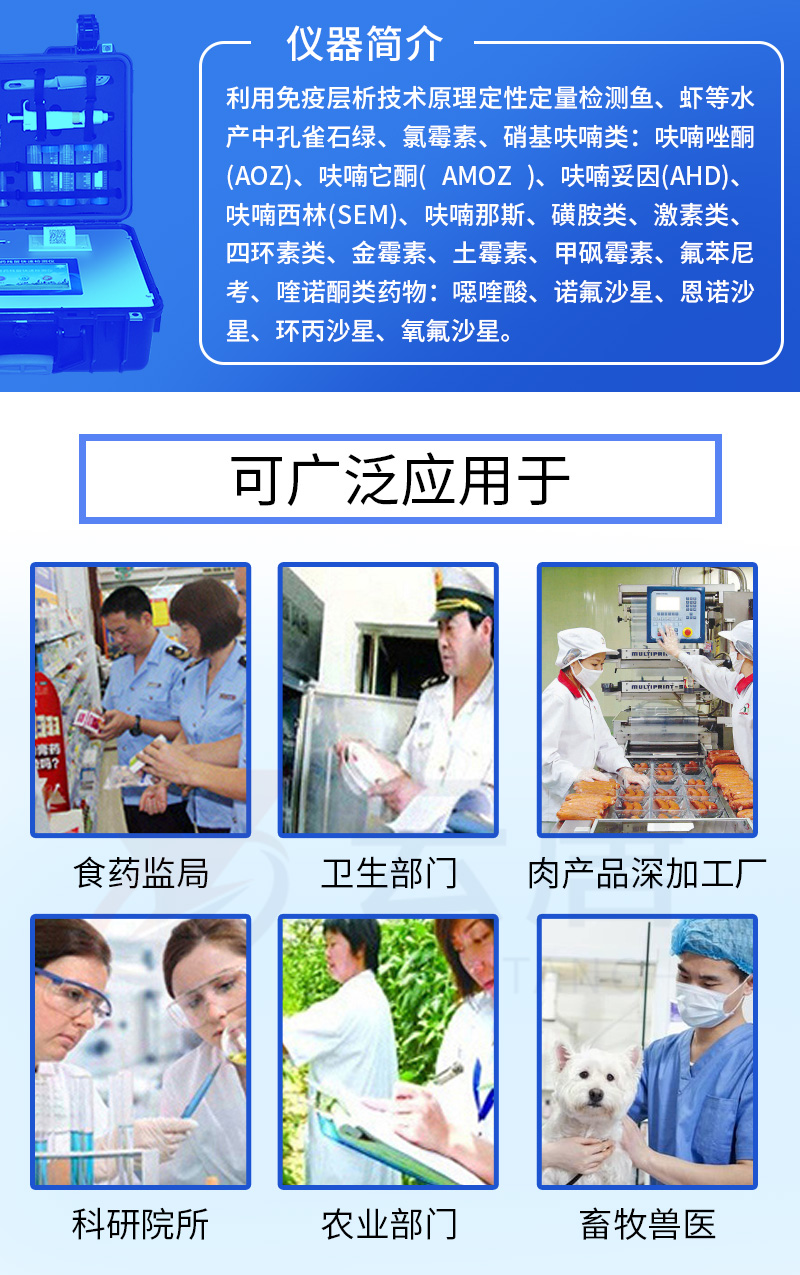 該儀器廣泛應用于食藥監(jiān)局、衛(wèi)生監(jiān)督部門、農(nóng)業(yè)部門、商業(yè)系統(tǒng)養(yǎng)殖場、屠宰場、食品肉產(chǎn)品深加工企業(yè)、畜牧獸醫(yī)、檢驗檢疫部門、食品生產(chǎn)企業(yè)、農(nóng)副產(chǎn)品批發(fā)市場、農(nóng)業(yè)生產(chǎn)基地、超市、餐廳、高教院校、食堂等單位部門對食品中的不安全指標進行監(jiān)測使用。