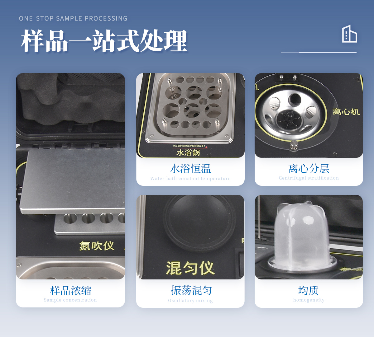 應(yīng)國(guó)內(nèi)用戶的實(shí)際需求,自行研制開發(fā)的新型儀器——QC05型樣品前處理一體機(jī)。樣品前處理集成箱將樣本前處理過(guò)程中樣品濃縮、水浴恒溫、離心分層、均質(zhì)、振蕩混勻等步驟所需設(shè)備進(jìn)行集成,僅需一臺(tái)樣品前處理集成箱設(shè)備即可完成所有樣本前處理過(guò)程,并且方便攜帶,不僅適用于現(xiàn)場(chǎng)檢測(cè)使用,還可用于色譜、質(zhì)譜等分析樣品的純化和制備。