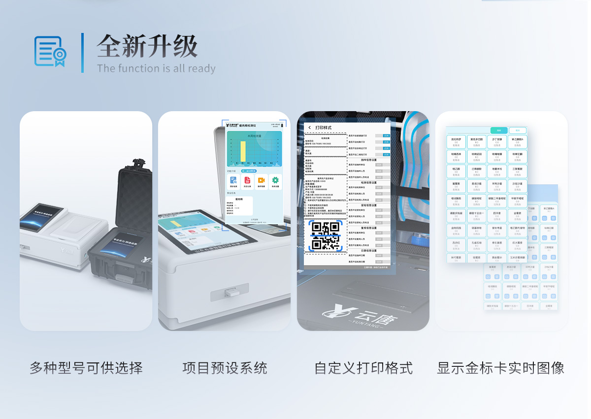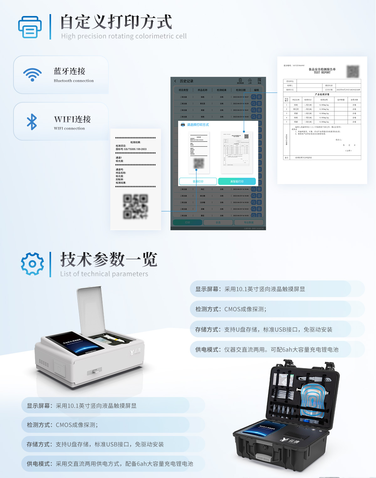 | 儀器采用10.1英寸液晶觸摸屏顯,搭配運行安卓智能操作系統(tǒng),主控芯片采用ARM Cortex-A7,RK3288/4核處理器,主頻1.88Ghz,運轉(zhuǎn)速度更快速,性能更強。 | 儀器功能包括:膠體金檢測模塊、數(shù)字化管理模塊、無線通訊模塊等,可以滿足同一軟件下實現(xiàn)所有檢測項目的檢測,并在同一窗口展示檢測結(jié)果。 | 一體化便攜式快檢設(shè)備,采用交直流兩用供電方式,可連接車載電源,配備6ah大容量充電鋰電池,可以滿足現(xiàn)場及流動檢測使用的需求。儀器尺寸:43×35×20cm, 主機凈重:5.1kg | 系統(tǒng)自帶數(shù)據(jù)集成模塊,設(shè)備首頁自動統(tǒng)計檢測數(shù)據(jù)包含:周檢測數(shù)據(jù)、月檢測數(shù)據(jù),全部檢測總數(shù)量,均包含檢測總數(shù),合格數(shù),不合格數(shù),以及相關(guān)柱形分析圖,對各項檢測數(shù)據(jù)清晰掌握,無需電腦查詢,更加快捷直觀。 | 儀器具有任務(wù)預(yù)設(shè)模塊,可在樣品送檢前提前預(yù)設(shè)樣品名稱、檢測指標(biāo)、送檢單位等信息,樣品送檢時一鍵調(diào)取保存信息,檢測更加方便快捷。 | 軌道式自動傳輸掃描方式,可實時顯示金標(biāo)卡實時圖像,系統(tǒng)自動分析并呈現(xiàn)出CT曲線圖,CT線自動識別,無需手動調(diào)整,完成檢測后自動退出檢測卡。 | 膠體金模塊檢測方式:軌道式自動傳輸掃描,檢測完成后自動退出檢測卡。 | 儀器檢測系統(tǒng)擁有龐大數(shù)據(jù)庫,并且構(gòu)建了完善的檢索、修訂功能。食品庫涵蓋多種樣品名稱,可按需添加或刪除、編輯樣品名稱;產(chǎn)品數(shù)據(jù)庫以及歷史檢測記錄支持一鍵檢索功能。 | 系統(tǒng)打印自定義化,打印格式多樣化,產(chǎn)品合格證(國家標(biāo)準(zhǔn)要求),二維碼,抽樣信息、檢測信息,受檢信息、復(fù)核信息、抽樣日期、檢測日期等信息結(jié)果,可按需求自行設(shè)置打印內(nèi)容。 | A4紙版本報告打印功能(可選配):設(shè)備擁有兩種結(jié)果展示方式,可以自動生成A4打印模板和小票打印模板兩種樣式,可通過WiFi及網(wǎng)線等方式鏈接外置打印機可進(jìn)行打印 | 儀器具有 wifi 聯(lián)網(wǎng)上傳、RJ45網(wǎng)線連接功能,可以快速上傳數(shù)據(jù)。同步對接監(jiān)管平臺,數(shù)據(jù)可局域網(wǎng)和互聯(lián)網(wǎng)數(shù)據(jù)上傳,檢測結(jié)果直接傳至食品安全監(jiān)管平臺。進(jìn)行區(qū)域食品安全監(jiān)管及大數(shù)據(jù)分析處理與數(shù)據(jù)統(tǒng)計,檢測區(qū)域食品安全長短期動態(tài),達(dá)到食品安全問題預(yù)估、預(yù)警。 | 設(shè)備支持U盤存儲,標(biāo)準(zhǔn)USB接口,免驅(qū)動安裝。檢測結(jié)果存儲容量20萬條以上,可生成Excel表格,進(jìn)行一鍵拷貝,并具有登錄保護(hù)功能,可設(shè)置用戶名及密碼,規(guī)范不同人員操作權(quán)限,防止非工作人員操作,并且可以進(jìn)行重新校準(zhǔn)、鎖定、恢復(fù)出廠設(shè)置功能。儀器固件可升級,后期檢測項目可擴(kuò)充。 | 儀器具備遠(yuǎn)程升級功能,可定向分客戶分儀器更新,開機后自動更新,并可持續(xù)性免費更新系統(tǒng)版本,無需像傳統(tǒng)產(chǎn)品返廠更新,節(jié)省時間及人力成本并避免了物流運輸返廠升級導(dǎo)致設(shè)備損壞的潛在風(fēng)險。 |