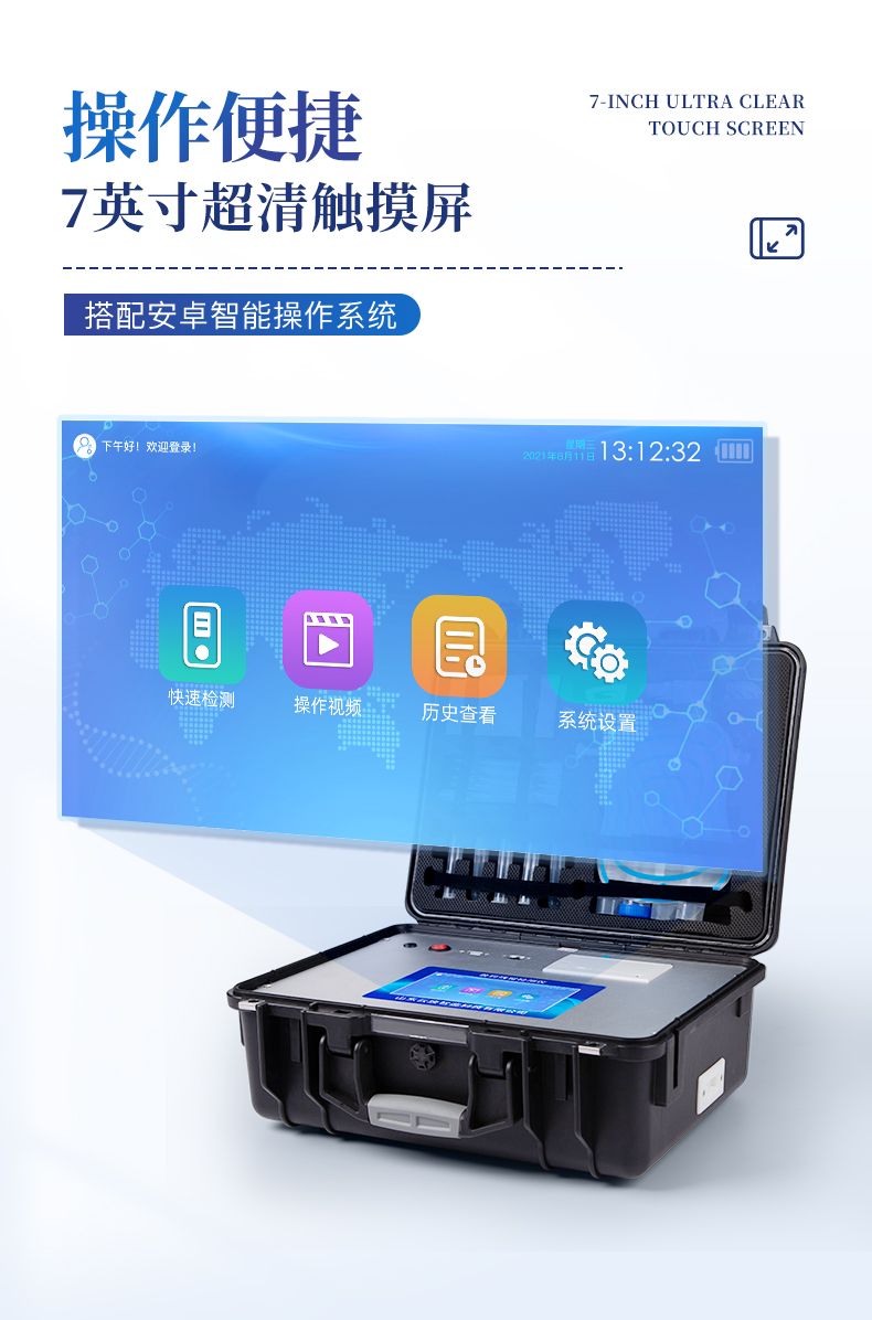 | 儀器采用手提式一體化系統(tǒng)檢測技術(shù),將分光光度模塊、新型農(nóng)殘檢測模塊、數(shù)字化管理模塊、無線通訊模塊高度集成于一體,支持檢測200種食品安全檢測項(xiàng)目,同時(shí)預(yù)留升級檢測方法。 | 儀器檢測模塊標(biāo)準(zhǔn)化、智能化,檢測項(xiàng)目可隨意自由組合。檢測箱體內(nèi)置多個(gè)標(biāo)準(zhǔn)檢測單元,檢測模塊可以調(diào)整配置。 | 顯示屏幕:儀器采用10.1英寸豎向液晶觸摸屏顯,搭配運(yùn)行安卓智能操作系統(tǒng),主控芯片采用ARM Cortex-A7,RK3288/4核處理器,主頻1.88Ghz,操作方便,性能更強(qiáng)。 | 檢測通道:≥12通道;采用精密旋轉(zhuǎn)比色池設(shè)計(jì),使用同芯片同光源校準(zhǔn)精度,解決不同光源之間的誤差值,更加準(zhǔn)確**。(1-12通道間誤差0.1%,***:**202022821055.2) | 儀器光源:高精度進(jìn)口四波長冷光源,每個(gè)通道均配置 410、520、590、630nm 波長光源,標(biāo)配**的光路切換裝置,專利光路切換功能可實(shí)現(xiàn)64波長,并且所有檢測項(xiàng)目可實(shí)現(xiàn)所有通道同時(shí)檢測。 | 設(shè)備可一鍵校準(zhǔn),自動保存校準(zhǔn)數(shù)據(jù),自動對比校驗(yàn),得到精準(zhǔn)光源,采用Android SP存儲數(shù)據(jù),光源數(shù)據(jù)永不丟失,方便每一次使用。 | 通訊接口:配備無線通信模塊、4G(APN)通訊模塊、藍(lán)牙傳輸,同時(shí)具有雙USB接口以及RJ45網(wǎng)線接口,可以多方式實(shí)現(xiàn)數(shù)據(jù)保存及數(shù)據(jù)傳輸 | 存儲方式:支持U盤存儲,標(biāo)準(zhǔn)USB接口,免驅(qū)動安裝。檢測結(jié)果存儲容量20萬條以上,可生成Excel表格進(jìn)行拷貝,并具有登錄保護(hù)功能。 | 智能化操作系統(tǒng): | 1)操作系統(tǒng):儀器可在同一檢測界面自動對應(yīng)相關(guān)檢測通道,一次性選擇1-12個(gè)樣品名稱,無需退出界面,節(jié)省操作時(shí)間。并可以對每個(gè)通道屬性和樣品信息單獨(dú)進(jìn)行編輯,例如送檢單位、人員,檢測人員等,打印時(shí)勾選打印顯示。 | 2)數(shù)據(jù)集成系統(tǒng):設(shè)備首頁自動匯總分析檢測數(shù)據(jù),包含:周檢測數(shù)據(jù)、月檢測數(shù)據(jù),全部檢測總數(shù)量,均包含檢測總數(shù),合格數(shù),不合格數(shù),以及相關(guān)柱形分析圖,各項(xiàng)檢測數(shù)據(jù)一目了然,無需電腦查詢,更加快捷直觀。 | 3)數(shù)據(jù)庫系統(tǒng):十幾項(xiàng)數(shù)據(jù)庫分類管理儀器:包含項(xiàng)目類型、項(xiàng)目數(shù)據(jù)、檢測數(shù)據(jù)、歷史記錄、國標(biāo)信息、曲線信息、采樣信息、檢測信息、受檢信息、復(fù)核信息、圖表信息、光源校準(zhǔn)信息、打印樣式信息、樣品庫信息等等,數(shù)據(jù)庫之間互相協(xié)調(diào)聯(lián)動保證數(shù)據(jù)的真實(shí)完整性。同時(shí)產(chǎn)品數(shù)據(jù)庫以及歷史檢測記錄支持一鍵檢索功能。 | 4)限量規(guī)判系統(tǒng):具有限量查詢、添加物質(zhì)合規(guī)判定系統(tǒng)。檢測出結(jié)果后,系統(tǒng)自動調(diào)用系統(tǒng)數(shù)據(jù)庫中相關(guān)國標(biāo)進(jìn)行比對判定,客觀顯示判定結(jié)果是否合格。 | 5)項(xiàng)目預(yù)設(shè)系統(tǒng):儀器具有任務(wù)預(yù)設(shè)模塊,一鍵提前預(yù)設(shè),給出方便快捷的新檢測方案,每一個(gè)任務(wù)分別可以設(shè)置不同的樣品、批次、編號、來源、備注、抽樣信息、檢測信息、受檢信息、復(fù)核信息等更多信息。樣品送檢時(shí)一鍵調(diào)取保存信息,并可多次調(diào)取,大大提高檢測效率。 | 6)數(shù)據(jù)監(jiān)管系統(tǒng):同步對接監(jiān)管平臺,數(shù)據(jù)可局域網(wǎng)和互聯(lián)網(wǎng)數(shù)據(jù)上傳,檢測結(jié)果可選擇直接傳至食品安全監(jiān)管平臺。進(jìn)行區(qū)域食品安全監(jiān)管及大數(shù)據(jù)分析處理與數(shù)據(jù)統(tǒng)計(jì),檢測區(qū)域食品安全長短期動態(tài),達(dá)到食品安全問題預(yù)估、預(yù)警。 | 7)打印系統(tǒng):內(nèi)置全新打印機(jī),新創(chuàng)自定義打印方式,可按需靈活勾選控制:產(chǎn)品合格證(國家農(nóng)業(yè)部標(biāo)準(zhǔn)要求),二維碼,抽樣信息、檢測信息,受檢信息、復(fù)核信息、抽樣日期、檢測日期等信息的打印。 | 供電模式:儀器交直流兩用,直流12V供電,可連接車載電源,可配6ah大容量充電鋰電池,電量可實(shí)時(shí)顯示,方便戶外流動測試。 | 膠體金檢測模塊:采用雙通道CMOS成像處理技術(shù)及膠體金免疫層析技術(shù),可同時(shí)讀取雙膠體金卡數(shù)據(jù),自動采集、處理分析,將檢測結(jié)果顯示,并可根據(jù)參考限值自動判斷檢測結(jié)果,可檢測常見的獸藥殘留、生物毒素、抗生素、違禁添加物等。 | 1)探測技術(shù):CMOS成像探測; | 2)檢測通道:1個(gè)通道; | 3)檢測方式:消線法和比色法; | 4)顯示模式:陰性或陽性; | 5)曲線形式:軌道式掃描方式,顯示金標(biāo)卡圖像,實(shí)時(shí)生成、識別CT曲線圖,無需手動調(diào)整,完成檢測后自動退出檢測卡。兼容市場上其他金標(biāo)卡,使用耗材不受限制。 | 儀器加入遠(yuǎn)程升級功能,可定向分客戶分儀器更新,開機(jī)后自動更新,客戶無需任何操作,即可升級全新項(xiàng)目。做到了無需退換機(jī)器即可實(shí)現(xiàn)實(shí)時(shí)遠(yuǎn)程升級檢測儀