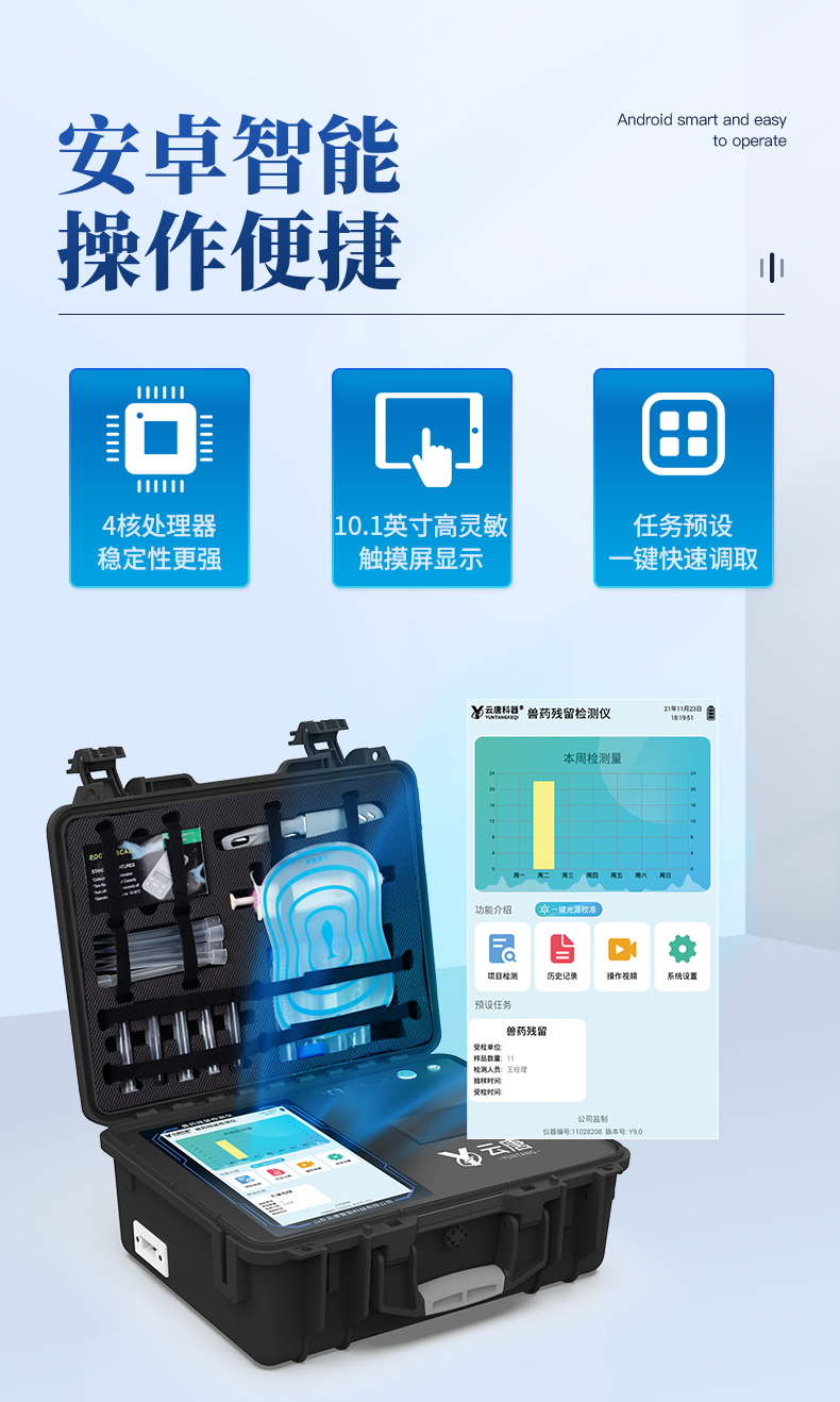 | 儀器采用臺(tái)式一體化系統(tǒng)檢測(cè)技術(shù),將分光光度模塊、數(shù)字化管理模塊、無(wú)線通訊模塊高度集成于一體,可支持檢測(cè)60種食品安全檢測(cè)項(xiàng)目,同時(shí)預(yù)留升級(jí)檢測(cè)方法。 | 儀器檢測(cè)模塊標(biāo)準(zhǔn)化、智能化,檢測(cè)項(xiàng)目可隨意自由組合。檢測(cè)箱體內(nèi)置多個(gè)標(biāo)準(zhǔn)檢測(cè)單元,檢測(cè)模塊可以調(diào)整配置。 | 顯示屏幕:儀器采用10.1英寸豎向液晶觸摸屏顯,搭配運(yùn)行安卓智能操作系統(tǒng),主控芯片采用ARM Cortex-A7,RK3288/4核處理器,主頻1.88Ghz,操作方便,性能更強(qiáng)。 | 檢測(cè)通道:≥12通道;采用精密旋轉(zhuǎn)比色池設(shè)計(jì),使用同芯片同光源校準(zhǔn)精度,解決不同光源之間的誤差值,更加準(zhǔn)確**。(1-12通道間誤差0.1%,***:**202022821055.2) | 儀器光源:高精度進(jìn)口四波長(zhǎng)冷光源,每個(gè)通道均配置 410、520、590、630nm 波長(zhǎng)光源,標(biāo)配**的光路切換裝置,專利光路切換功能可實(shí)現(xiàn)64波長(zhǎng),并且所有檢測(cè)項(xiàng)目可實(shí)現(xiàn)所有通道同時(shí)檢測(cè)。 | 設(shè)備可一鍵校準(zhǔn),自動(dòng)保存校準(zhǔn)數(shù)據(jù),自動(dòng)對(duì)比校驗(yàn),得到精準(zhǔn)光源,采用Android SP存儲(chǔ)數(shù)據(jù),光源數(shù)據(jù)永不丟失,方便每一次使用。 | 通訊接口:配備無(wú)線通信模塊、4G(APN)通訊模塊、藍(lán)牙傳輸,同時(shí)具有雙USB接口以及RJ45網(wǎng)線接口,可以多方式實(shí)現(xiàn)數(shù)據(jù)保存及數(shù)據(jù)傳輸。 | 存儲(chǔ)方式:支持U盤存儲(chǔ),標(biāo)準(zhǔn)USB接口,免驅(qū)動(dòng)安裝。檢測(cè)結(jié)果存儲(chǔ)容量20萬(wàn)條以上,可生成Excel表格進(jìn)行拷貝,并具有登錄保護(hù)功能。 | 智能化操作系統(tǒng): | 1、操作系統(tǒng):儀器可在同一檢測(cè)界面自動(dòng)對(duì)應(yīng)相關(guān)檢測(cè)通道,一次性選擇1-12個(gè)樣品名稱,無(wú)需退出界面,節(jié)省操作時(shí)間。并可以對(duì)每個(gè)通道屬性和樣品信息單獨(dú)進(jìn)行編輯,例如送檢單位、人員,檢測(cè)人員等,打印時(shí)勾選打印顯示。 | 2、數(shù)據(jù)集成系統(tǒng):設(shè)備首頁(yè)自動(dòng)匯總分析檢測(cè)數(shù)據(jù),包含:周檢測(cè)數(shù)據(jù)、月檢測(cè)數(shù)據(jù),全部檢測(cè)總數(shù)量,均包含檢測(cè)總數(shù),合格數(shù),不合格數(shù),以及相關(guān)柱形分析圖,各項(xiàng)檢測(cè)數(shù)據(jù)一目了然,無(wú)需電腦查詢,更加快捷直觀。 | 3、數(shù)據(jù)庫(kù)系統(tǒng):十幾項(xiàng)數(shù)據(jù)庫(kù)分類管理儀器:包含項(xiàng)目類型、項(xiàng)目數(shù)據(jù)、檢測(cè)數(shù)據(jù)、歷史記錄、國(guó)標(biāo)信息、曲線信息、采樣信息、檢測(cè)信息、受檢信息、復(fù)核信息、圖表信息、光源校準(zhǔn)信息、打印樣式信息、樣品庫(kù)信息等等,數(shù)據(jù)庫(kù)之間互相協(xié)調(diào)聯(lián)動(dòng)保證數(shù)據(jù)的真實(shí)完整性。同時(shí)產(chǎn)品數(shù)據(jù)庫(kù)以及歷史檢測(cè)記錄支持一鍵檢索功能。 | 4、限量規(guī)判系統(tǒng):具有限量查詢、添加物質(zhì)合規(guī)判定系統(tǒng)。檢測(cè)出結(jié)果后,系統(tǒng)自動(dòng)調(diào)用系統(tǒng)數(shù)據(jù)庫(kù)中相關(guān)國(guó)標(biāo)進(jìn)行比對(duì)判定,客觀顯示判定結(jié)果是否合格。 | 5、項(xiàng)目預(yù)設(shè)系統(tǒng):儀器具有任務(wù)預(yù)設(shè)模塊,一鍵提前預(yù)設(shè),給出方便快捷的新檢測(cè)方案,每一個(gè)任務(wù)分別可以設(shè)置不同的樣品、批次、編號(hào)、來(lái)源、備注、抽樣信息、檢測(cè)信息、受檢信息、復(fù)核信息等更多信息。樣品送檢時(shí)一鍵調(diào)取保存信息,并可多次調(diào)取,大大提高檢測(cè)效率。 | 6、數(shù)據(jù)監(jiān)管系統(tǒng):同步對(duì)接監(jiān)管平臺(tái),數(shù)據(jù)可局域網(wǎng)和互聯(lián)網(wǎng)數(shù)據(jù)上傳,檢測(cè)結(jié)果可選擇直接傳至食品安全監(jiān)管平臺(tái)。進(jìn)行區(qū)域食品安全監(jiān)管及大數(shù)據(jù)分析處理與數(shù)據(jù)統(tǒng)計(jì),檢測(cè)區(qū)域食品安全長(zhǎng)短期動(dòng)態(tài),達(dá)到食品安全問題預(yù)估、預(yù)警。 | 7.1、全新打印系統(tǒng):內(nèi)置全新打印機(jī),新創(chuàng)自定義打印方式,可按需靈活勾選控制:二維碼,抽樣信息、檢測(cè)信息,受檢信息、復(fù)核信息、抽樣日期、檢測(cè)日期等信息的打印。 | 7.2、A4紙版本報(bào)告打印功能(可選配):設(shè)備擁有兩種結(jié)果展示方式,可以自動(dòng)生成A4打印模板和小票打印模板兩種樣式,可通過WiFi及網(wǎng)線等方式鏈接外置打印機(jī)可進(jìn)行打印。 | 供電模式:儀器交直流兩用,直流12V供電,可連接車載電源,可配6ah大容量充電鋰電池,電量可實(shí)時(shí)顯示,方便戶外流動(dòng)測(cè)試。 | 儀器具備遠(yuǎn)程升級(jí)功能,可定向分客戶分儀器更新,開機(jī)后自動(dòng)更新,并可持續(xù)性免費(fèi)更新系統(tǒng)版本,無(wú)需像傳統(tǒng)產(chǎn)品返廠更新,節(jié)省時(shí)間及人力成本并避免了物流運(yùn)輸返廠升級(jí)導(dǎo)致設(shè)備損壞的潛在風(fēng)險(xiǎn)。 |
