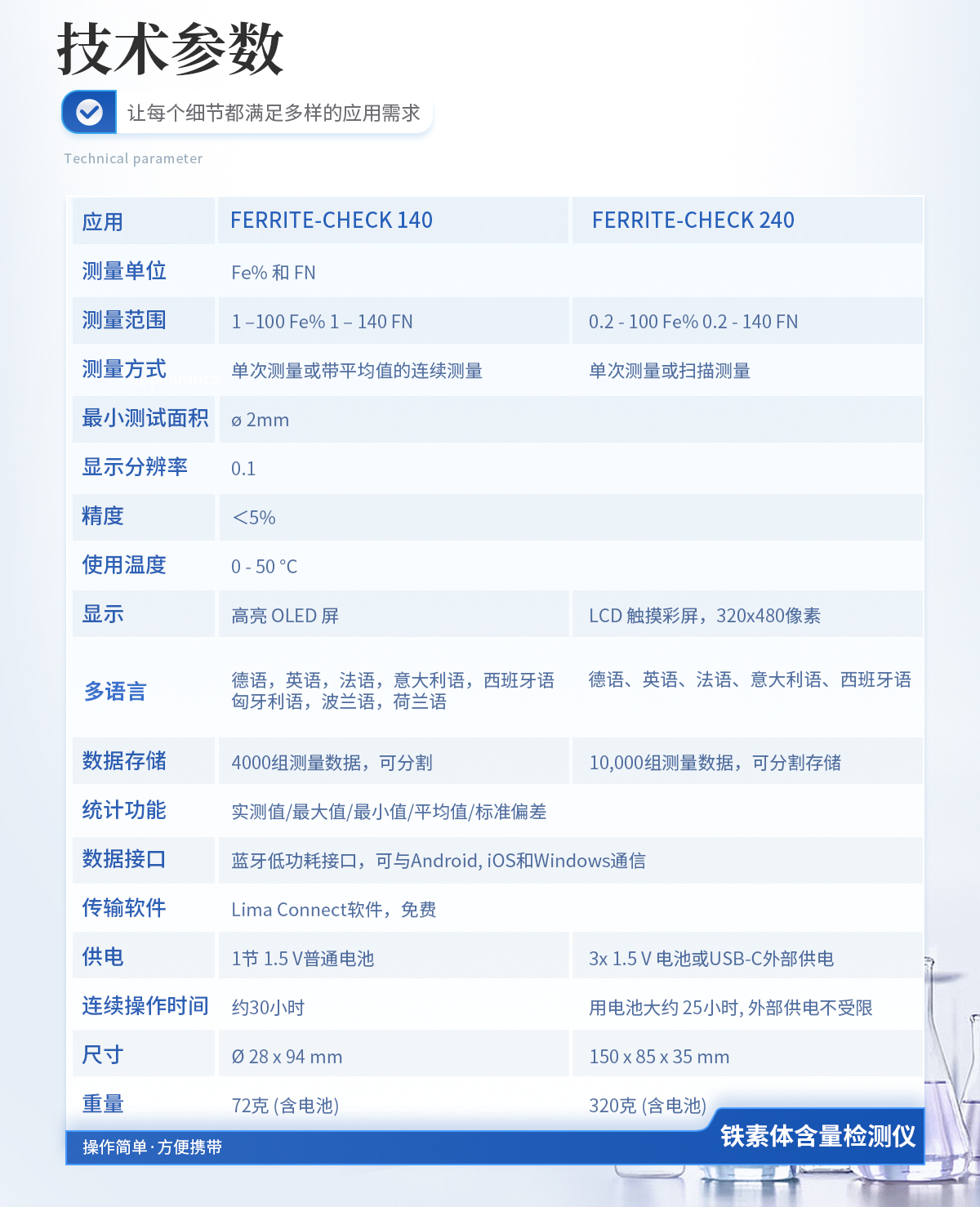 鐵素體含量檢測儀操作簡單 List-Magnetik公司 FERRITE-CHECK 140鐵素體含量檢測儀是一款設計緊湊、使用方便的便攜儀器,儀器配有集成探頭,儀器符合Basel標準DIN EN ISO 8249,使用磁感應法測量奧氏體鋼和雙相鋼中的鐵素體含量。 高亮OLED顯示鐵素體含量 FERRITE-CHECK 140鐵素體含量檢測儀只有一個按鈕,并配有多語言菜單導航,非常易于使用。高亮度OLED屏顯示FN或Fe%的測量結果。 測量焊縫中的鐵素體含量 特別是對于焊接的雙相鋼,重要的是要知道焊縫是否有足夠的鐵素體含量來保證焊縫的強度。鐵素體含量低的話,焊縫受熱后較容易產生裂紋,但如果鐵素體含量過高,焊縫的韌性和延展性將會喪失。 快速連續(xù)鐵素體含量測量 使用FERRITE-CHECK 140鐵素體含量檢測儀,可以非常準確和快速地測定鐵素體含量。檢測光滑或拋光表面上的焊縫時,可以將儀器切換到快速連續(xù)測量模式。當探頭放置在表面上并沿表面移動時,測量值將連續(xù)存儲,在提起探頭后,屏幕將顯示的*小值、**值和平均值組成的統(tǒng)計信息。 校準鐵素體含量檢測儀 FERRITE-CHECK 140鐵素體含量檢測儀配有3個校準標準片,可追溯到NIST 管理和發(fā)送測量數(shù)據(jù)與免費的應用程序 為了進一步處理測量數(shù)據(jù),您可以將FERRITE-CHECK 140鐵素體含量檢測儀與移動Android和iOS設備配對。或者與一臺Windows電腦通信。這是由低功耗藍牙技術(BLE)實現(xiàn)的。使用Lima Connect應用程序,您可以管理項目并在照片上分配測量點。測量結果可以統(tǒng)計評估和圖形顯示。這款應用適用于安卓、iOS和Windows系統(tǒng),軟件免費的。