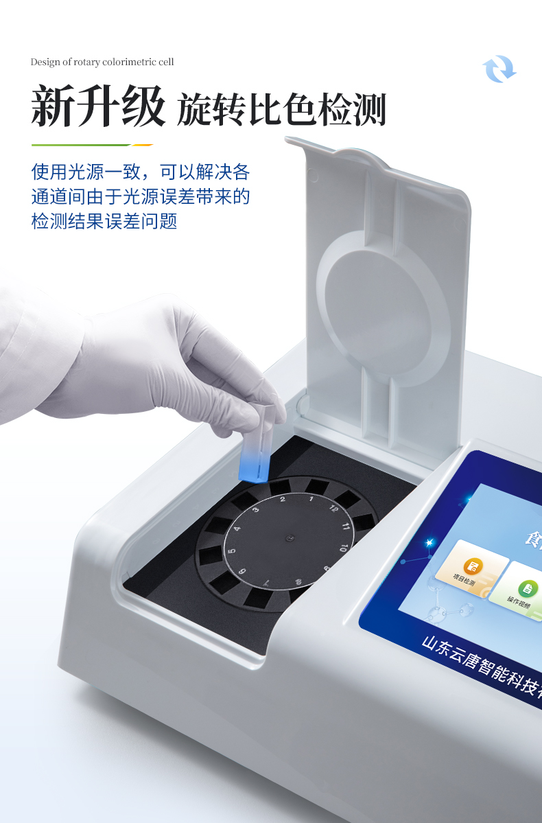 4、檢測通道:12通道;采用精密旋轉(zhuǎn)比色池設計,使用同芯片同光源校準精度,解決不同光源之間的誤差值,更加準確**。