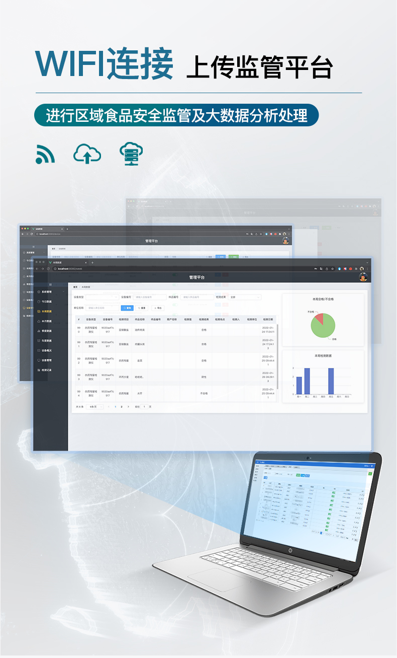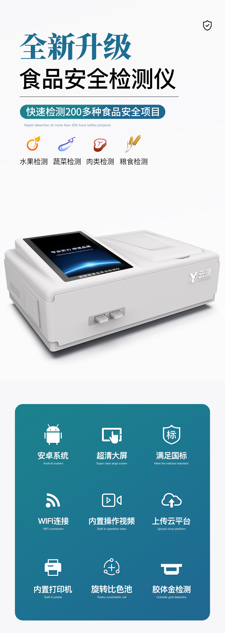 | 儀器采用臺式一體化系統(tǒng)檢測技術(shù),將分光光度模塊、新型農(nóng)殘檢測模塊、數(shù)字化管理模塊、無線通訊模塊高度集成于一體,支持檢測200種食品安全檢測項目,同時預(yù)留升級檢測方法。 | 儀器檢測模塊標(biāo)準(zhǔn)化、智能化,可隨意自由組合。檢測箱體內(nèi)置多個標(biāo)準(zhǔn)檢測單元,檢測模塊可以調(diào)整配置。 | 儀器采用全新安卓智能系統(tǒng),主控芯片采用 ARM Cortex-A7,RK3288/4核處理器,10.1寸高清液晶觸摸豎屏,更加**的UI交互界面,運轉(zhuǎn)快捷;儀器配備無線通信模塊: 4G(APN)通訊模塊、Wifi模塊,藍(lán)牙傳輸,同時具有雙USB接口以及RJ45接口能以多種方式實現(xiàn)數(shù)據(jù)保存和數(shù)據(jù)傳輸功能。 | 創(chuàng)新檢測模式: | ★檢測通道:≥12通道;采用精密旋轉(zhuǎn)比色池設(shè)計,使用同芯片同光源校準(zhǔn)精度,解決不同光源之間的誤差值。1-12通道間誤差0.1%。(***:**202022821055.2) | ★儀器具有自動識別比色皿檢測功能,即:將樣品比色皿放入儀器后,點擊樣品檢測,儀器自動識別比色皿進行通道檢測。 | 進口高精光源: | 高精度進口四波長冷光源,通道配置 410、520、590、630nm 波長光源,一個光源芯片驅(qū)動一個光源,誤差極小,每臺設(shè)備單獨**校準(zhǔn)光源,**比對,同時參照四種不同波段光源全方位覆蓋市面上99%的農(nóng)殘食品項目檢測。 | 智能化操作系統(tǒng): | 便捷操作系統(tǒng):設(shè)備檢測時可在同一檢測界面自動對應(yīng)相關(guān)檢測通道一次性選擇1-12個樣品名稱,無須退出界面,節(jié)省操作時間。 | 數(shù)據(jù)集成系統(tǒng):設(shè)備首頁自動統(tǒng)計檢測數(shù)據(jù)包含:周檢測數(shù)據(jù)、月檢測數(shù)據(jù),全部檢測總數(shù)量,均包含檢測總數(shù),合格數(shù),不合格數(shù),以及相關(guān)柱形分析圖,對各項檢測數(shù)據(jù)清晰掌握,無需電腦查詢,更加快捷直觀。 | 項目預(yù)設(shè)系統(tǒng):支持添加單個及多個相同或不相同的任務(wù)預(yù)設(shè),一鍵快速調(diào)取,每一個任務(wù)分別可以設(shè)置不同的樣品、批次、編號、來源、備注、抽樣信息、檢測信息、受檢信息、復(fù)核信息等更多信息。無縫鏈接平臺和APP實時查看下發(fā)任務(wù)。 | 數(shù)據(jù)監(jiān)管系統(tǒng):同步對接監(jiān)管平臺,數(shù)據(jù)可局域網(wǎng)和互聯(lián)網(wǎng)數(shù)據(jù)上傳,檢測結(jié)果可選擇直接傳至食品安全監(jiān)管平臺。集成OSS輸出存儲服務(wù)、區(qū)分設(shè)備定向管理應(yīng)用,進行區(qū)域食品安全監(jiān)管及大數(shù)據(jù)分析處理與數(shù)據(jù)統(tǒng)計,檢測區(qū)域食品安全長短期動態(tài),達(dá)到食品安全問題預(yù)估、預(yù)警。 | 自定義打印系統(tǒng):內(nèi)置全新打印系統(tǒng),新創(chuàng)自定義打印方式,可按需靈活設(shè)置開啟或關(guān)閉:產(chǎn)品合格證(國家農(nóng)業(yè)部標(biāo)準(zhǔn)要求),二維碼,抽樣信息、檢測信息,受檢信息、復(fù)核信息、抽樣日期、檢測日期等信息的打印。 | 系統(tǒng)遠(yuǎn)程更新功能:可定向分客戶分儀器更新系統(tǒng),按照不同客戶后期實際需求添加項目,無需機器返廠,即可遠(yuǎn)程實時升級全新系統(tǒng),節(jié)省時間成本及避免運輸造成設(shè)備損壞。 | 儀器主機采用一體化防水、抗壓、防撞擊、防腐蝕箱體設(shè)計,同時配備交直流供電,可連接車載電源,可選配大容量充電鋰電池,滿足現(xiàn)場野外檢測需求。 | 安全證書,放心保障:儀器具有中國計量科學(xué)研究院校準(zhǔn)證書,權(quán)威認(rèn)證。 |