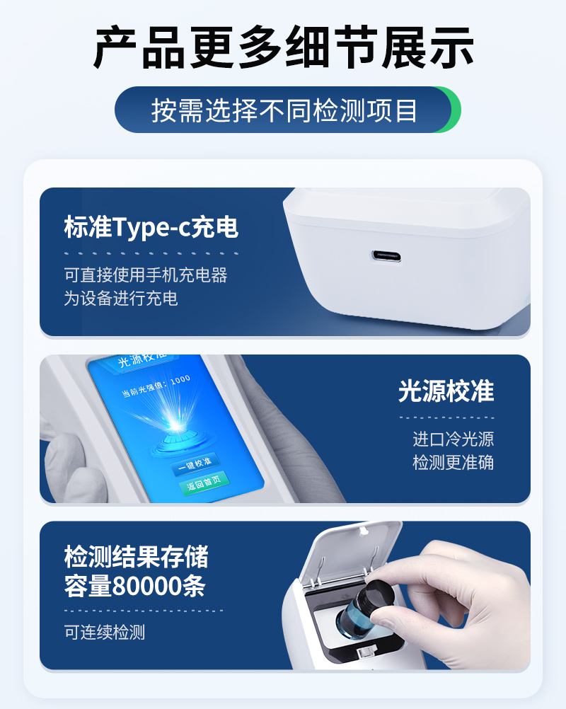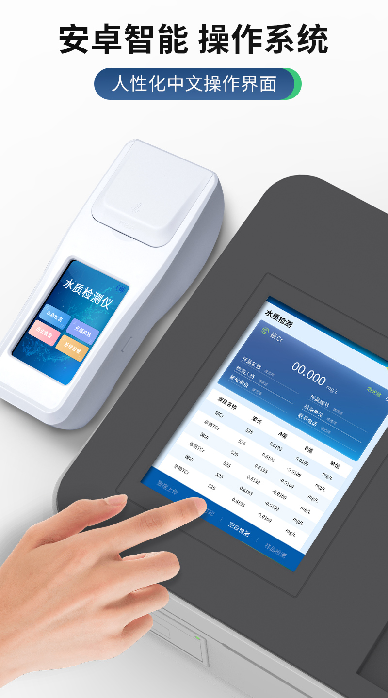 Android智能系統(tǒng),操作交互性體驗更好,更佳簡便快捷;3.5寸高清晰度觸控屏幕,數(shù)據(jù)更直觀配置監(jiān)管平臺,檢測結果可直接無線傳至平臺,進行水質長短期分析,輔助管理。內置操作流程、操作簡單、無需培訓、直接上手;檢測速度更快,現(xiàn)場讀取數(shù)據(jù);便攜式體積小,重量輕,方便戶外檢測;外形小巧美觀,工作穩(wěn)定免維護,具有較好的性價比;采用進口冷光源,光學性能穩(wěn)定,壽命長達10萬小時;交直流兩用,內置充電鋰電池,環(huán)保耐用可支持連續(xù)室內外工作。