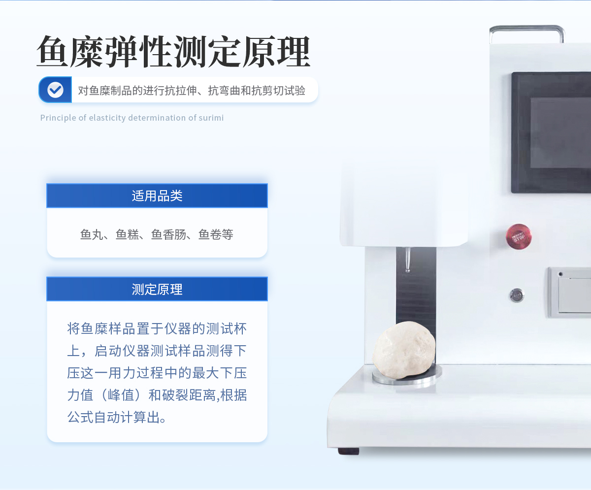 將魚糜樣品置于儀器的測試杯上,啟動(dòng)儀器測試樣品,測得下壓這一用力過程中的**下壓力值(峰值)和破裂距離,根據(jù)公式自動(dòng)計(jì)算出魚糜彈性值。
