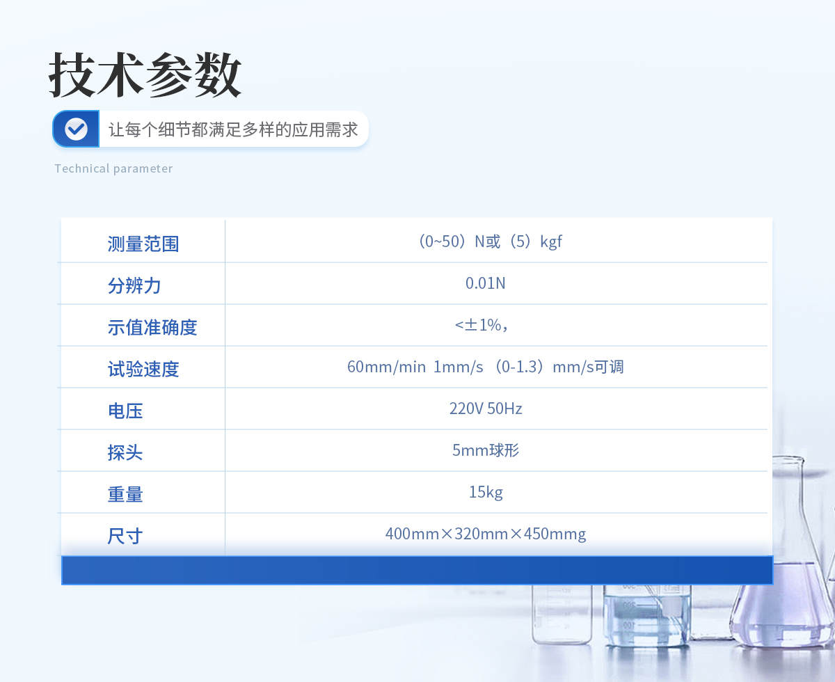 測量范圍:(0~50)N或(5)kgf 分辨力:0.01N 示值準(zhǔn)確度:<±1% 試驗(yàn)速度:60mm/min 1mm/s (0-1.3)mm/s可調(diào) 電壓:220V 50Hz 探頭:5mm球形 單位:g.cm 重量:15kg 尺寸:400mm×320mm×450mm