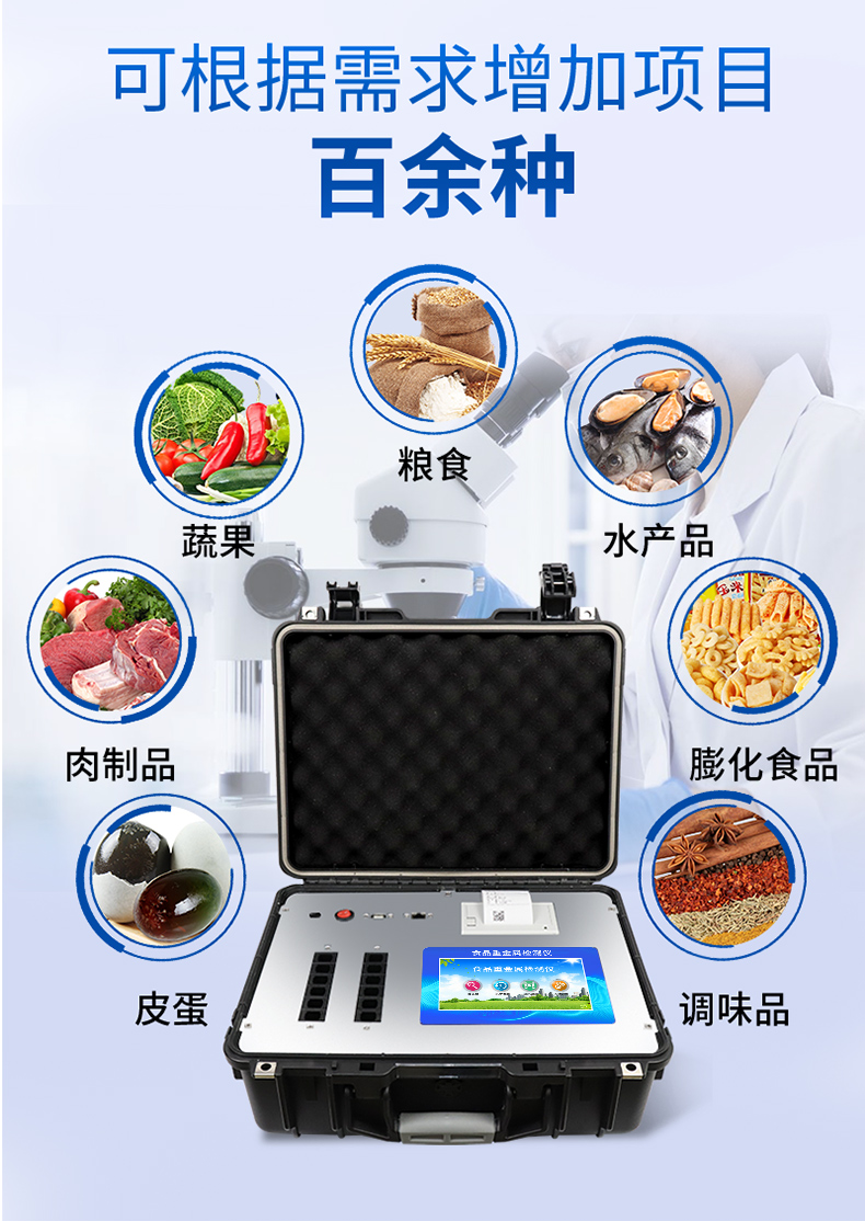 儀器采用臺式一體化系統(tǒng)檢測技術(shù),將分光光度模塊、新型農(nóng)殘檢測模塊、數(shù)字化管理模塊、無線通訊模塊高度集成于一體,支持檢測200種食品安全檢測項(xiàng)目,同時(shí)預(yù)留升級檢測方法。儀器檢測模塊標(biāo)準(zhǔn)化、智能化,可隨意自由組合。檢測箱體內(nèi)置多個(gè)標(biāo)準(zhǔn)檢測單元,檢測模塊可以調(diào)整配置。儀器采用全新安卓智能系統(tǒng),主控芯片采用 ARM Cortex-A7,RK3288/4核處理器,10.1寸高清液晶觸摸豎屏,更加**的UI交互界面,運(yùn)轉(zhuǎn)快捷;儀器配備無線通信模塊: 4G(APN)通訊模塊、Wifi模塊,藍(lán)牙傳輸,同時(shí)具有雙USB接口以及RJ45接口能以多種方式實(shí)現(xiàn)數(shù)據(jù)保存和數(shù)據(jù)傳輸功能。創(chuàng)新檢測模式:★檢測通道:≥12通道;采用精密旋轉(zhuǎn)比色池設(shè)計(jì),使用同芯片同光源校準(zhǔn)精度,解決不同光源之間的誤差值。1-12通道間誤差0.1%。(***:**202022821055.2)★儀器具有自動(dòng)識別比色皿檢測功能,即:將樣品比色皿放入儀器后,點(diǎn)擊樣品檢測,儀器自動(dòng)識別比色皿進(jìn)行通道檢測。進(jìn)口高精光源:高精度進(jìn)口四波長冷光源,通道配置 410、520、590、630nm 波長光源,一個(gè)光源芯片驅(qū)動(dòng)一個(gè)光源,誤差極小,每臺設(shè)備單獨(dú)**校準(zhǔn)光源,**比對,同時(shí)參照四種不同波段光源全方位覆蓋市面上99%的農(nóng)殘食品項(xiàng)目檢測。智能化操作系統(tǒng):便捷操作系統(tǒng):設(shè)備檢測時(shí)可在同一檢測界面自動(dòng)對應(yīng)相關(guān)檢測通道一次性選擇1-12個(gè)樣品名稱,無須退出界面,節(jié)省操作時(shí)間。數(shù)據(jù)集成系統(tǒng):設(shè)備首頁自動(dòng)統(tǒng)計(jì)檢測數(shù)據(jù)包含:周檢測數(shù)據(jù)、月檢測數(shù)據(jù),全部檢測總數(shù)量,均包含檢測總數(shù),合格數(shù),不合格數(shù),以及相關(guān)柱形分析圖,對各項(xiàng)檢測數(shù)據(jù)清晰掌握,無需電腦查詢,更加快捷直觀。項(xiàng)目預(yù)設(shè)系統(tǒng):支持添加單個(gè)及多個(gè)相同或不相同的任務(wù)預(yù)設(shè),一鍵快速調(diào)取,每一個(gè)任務(wù)分別可以設(shè)置不同的樣品、批次、編號、來源、備注、抽樣信息、檢測信息、受檢信息、復(fù)核信息等更多信息。無縫鏈接平臺和APP實(shí)時(shí)查看下發(fā)任務(wù)。數(shù)據(jù)監(jiān)管系統(tǒng):同步對接監(jiān)管平臺,數(shù)據(jù)可局域網(wǎng)和互聯(lián)網(wǎng)數(shù)據(jù)上傳,檢測結(jié)果可選擇直接傳至食品安全監(jiān)管平臺。集成OSS輸出存儲服務(wù)、區(qū)分設(shè)備定向管理應(yīng)用,進(jìn)行區(qū)域食品安全監(jiān)管及大數(shù)據(jù)分析處理與數(shù)據(jù)統(tǒng)計(jì),檢測區(qū)域食品安全長短期動(dòng)態(tài),達(dá)到食品安全問題預(yù)估、預(yù)警。自定義打印系統(tǒng):內(nèi)置全新打印系統(tǒng),新創(chuàng)自定義打印方式,可按需靈活設(shè)置開啟或關(guān)閉:產(chǎn)品合格證(國家農(nóng)業(yè)部標(biāo)準(zhǔn)要求),二維碼,抽樣信息、檢測信息,受檢信息、復(fù)核信息、抽樣日期、檢測日期等信息的打印。系統(tǒng)遠(yuǎn)程更新功能:可定向分客戶分儀器更新系統(tǒng),按照不同客戶后期實(shí)際需求添加項(xiàng)目,無需機(jī)器返廠,即可遠(yuǎn)程實(shí)時(shí)升級全新系統(tǒng),節(jié)省時(shí)間成本及避免運(yùn)輸造成設(shè)備損壞。儀器主機(jī)采用一體化防水、抗壓、防撞擊、防腐蝕箱體設(shè)計(jì),同時(shí)配備交直流供電,可連接車載電源,可選配大容量充電鋰電池,滿足現(xiàn)場野外檢測需求。安全證書,放心保障:儀器具有中國計(jì)量科學(xué)研究院校準(zhǔn)證書,權(quán)威認(rèn)證。