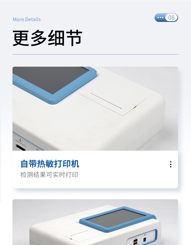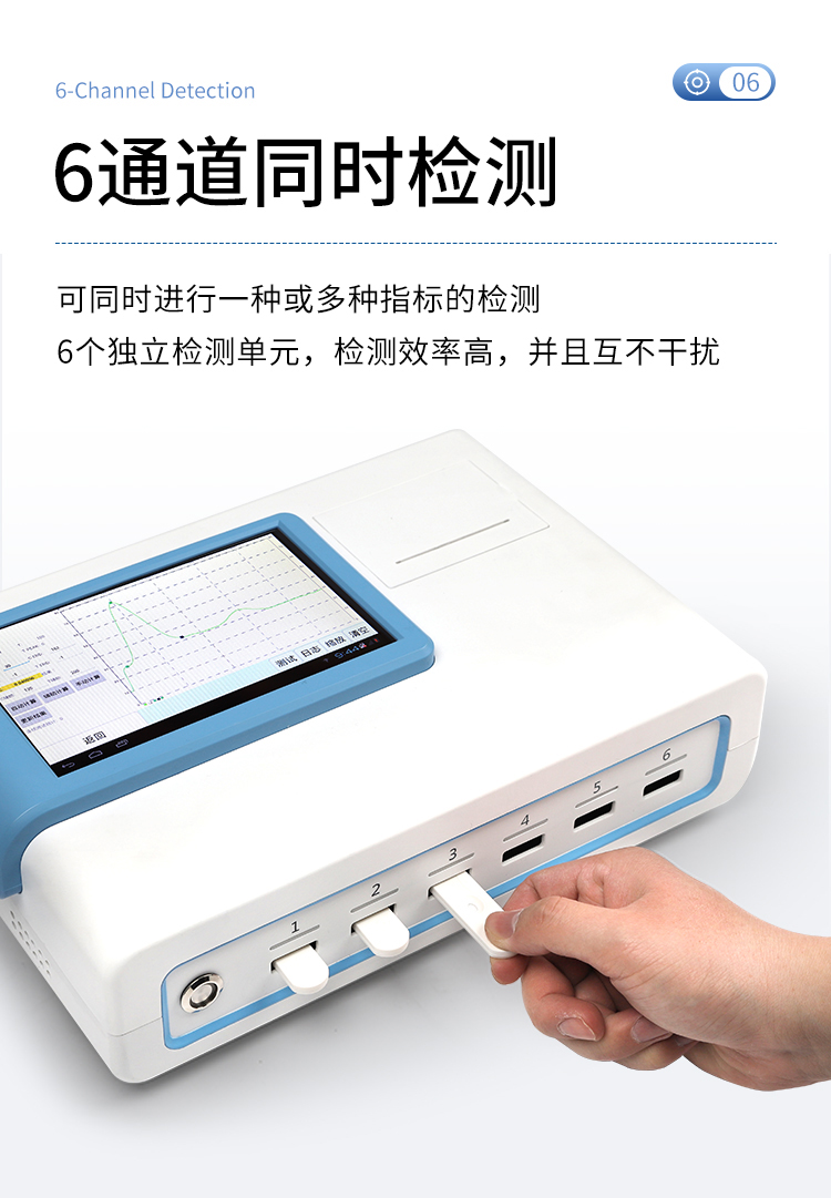 | 一體化設(shè)計(jì),集成孵育和檢測(cè)功能同時(shí)進(jìn)行,孵育完成直接檢測(cè); | 全中文 7英寸高清液晶顯示,觸摸屏操作; | Android 系統(tǒng),支持在線升級(jí),可WIFI聯(lián)網(wǎng); | 檢測(cè)原理:熒光定量免疫層析法; | 6通道設(shè)計(jì),可同時(shí)進(jìn)行一種或多種指標(biāo)的檢測(cè),6個(gè)獨(dú)立檢測(cè)單元,檢測(cè)效率高,并且互不干擾; | 具有二維碼自動(dòng)識(shí)別系統(tǒng),可直接識(shí)別檢測(cè)項(xiàng)目、檢測(cè)流程等信息; | 儀器自帶熱敏打印機(jī),檢測(cè)結(jié)果可實(shí)時(shí)打??; | 具有檢測(cè)數(shù)據(jù)存儲(chǔ)(存儲(chǔ)數(shù)量不少于 10000 條)、查詢(xún)、批量數(shù)據(jù)處理和打印功能; | 儀器≥2 個(gè)USB 接口,可拷貝結(jié)果及原始數(shù)據(jù),具有 wifi 接入模塊,可通過(guò)無(wú)線連接網(wǎng) 絡(luò)實(shí)現(xiàn)數(shù)據(jù)上傳; | 分鐘內(nèi)達(dá)到工作狀態(tài)(37℃),封閉系統(tǒng),不受外界環(huán)境(光、熱)干擾,工作環(huán)境溫度:0-30℃; | 相對(duì)極差≤10%; | 重復(fù)性 CV≤1%; | 批間變異≤3%; | 尺寸310x210x93mm |