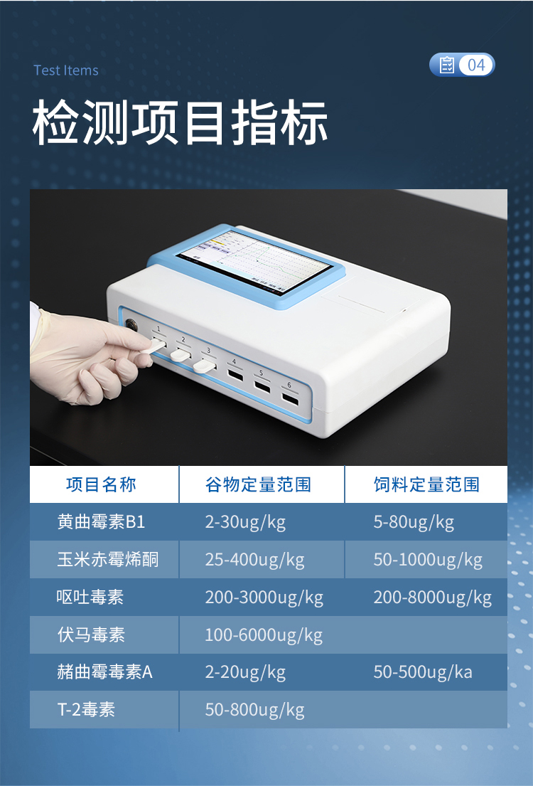 YT-L03P型真菌毒素快速檢測(cè)儀采用熒光定量快速檢測(cè)原理,主要檢測(cè)糧油谷物及飼料中真菌毒素和重金屬含量,包括黃曲霉毒素、玉米赤霉烯酮、嘔吐毒素、伏馬毒素、赭曲霉毒素、T-2毒素、重金屬鎘、重金屬鉛等等,檢測(cè)樣品涵蓋糧食谷物(大米、玉米、小麥、大麥、高粱等)及其制品、飼料及其原料、食用油脂、牛奶及其制品等;樣品前處理簡(jiǎn)單,整個(gè)檢測(cè)過(guò)程檢測(cè)12min,產(chǎn)品適用于地方糧庫(kù)、谷物生產(chǎn)企業(yè)、飼料廠、各類畜牧養(yǎng)殖企業(yè)、面粉廠、食品加工廠、第三方檢測(cè)機(jī)構(gòu)及各級(jí)政府監(jiān)管部門。