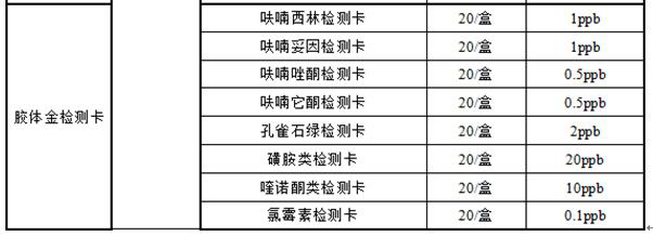 水產(chǎn)品的安全隱患主要是在養(yǎng)殖過程中藥物的過量使用及加工過程中添加劑的違規(guī)使用。食用水產(chǎn)品中對(duì)食品安全造成危害的藥物主要有:呋喃代謝物、四環(huán)素、環(huán)丙沙星等抗生素藥物殘留。公司針對(duì)市場(chǎng)上常見的水產(chǎn)品中藥物殘留開發(fā)對(duì)應(yīng)的檢測(cè)試劑盒及膠體金檢測(cè)卡如下表: