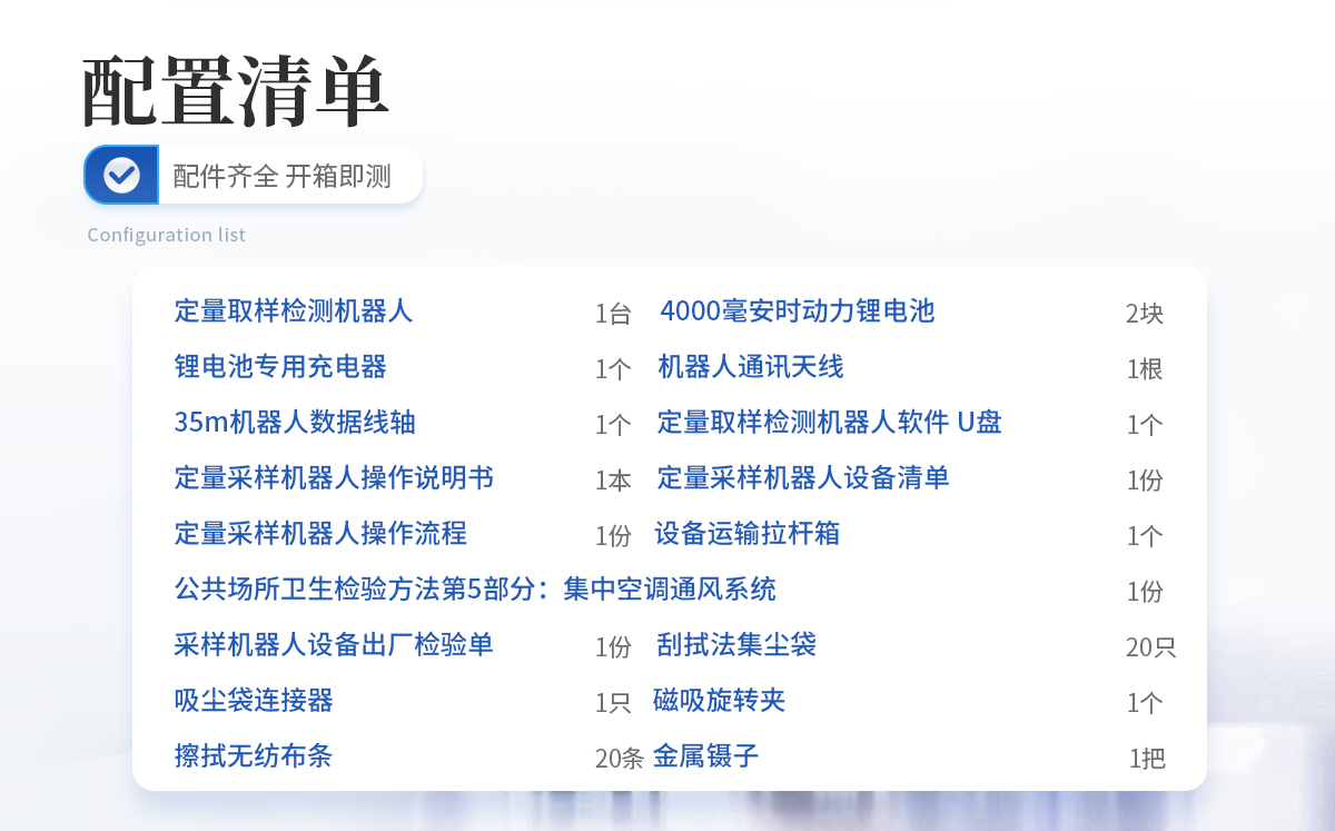 定量取樣檢測機器人:1臺 4000毫安時動力鋰電池:2塊 鋰電池專用充電器:1個 機器人通訊天線:1根 35m機器人數(shù)據(jù)線軸:1個 定量取樣檢測機器人軟件 U盤:1個 定量采樣機器人操作說明書:1本 定量采樣機器人設(shè)備清單:1份 定量采樣機器人操作流程:1份 公共場所衛(wèi)生檢驗方法第5部分:集中空調(diào)通風(fēng)系統(tǒng):1份 采樣機器人設(shè)備出廠檢驗單:1份 刮拭法集塵袋 :20只 吸塵袋連接器 :1只 磁吸旋轉(zhuǎn)夾:1個 擦拭無紡布條 :20條 金屬鑷子:1把 設(shè)備運輸拉桿箱:1個