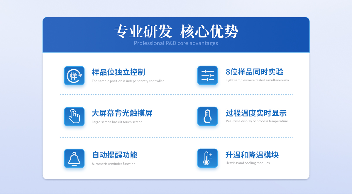 | ◆ 全樣品位:8位, | ◆ 樣品位可獨立控制:每個樣品位獨立控制,*多實現(xiàn)8位樣品同時實驗。 | ◆ 恒溫控制功能:**的升溫和降溫模塊,自動控制實驗操作在恒溫25℃下進行,實驗過程溫度實時顯示。 | ◆ 測量提醒功能:到達檢測條件后自動提醒功能,保證每次實驗的及時進行。 | ◆ 控溫精度:25℃±1℃ | ◆ 大屏幕背光觸摸屏,方便直觀操作。 |