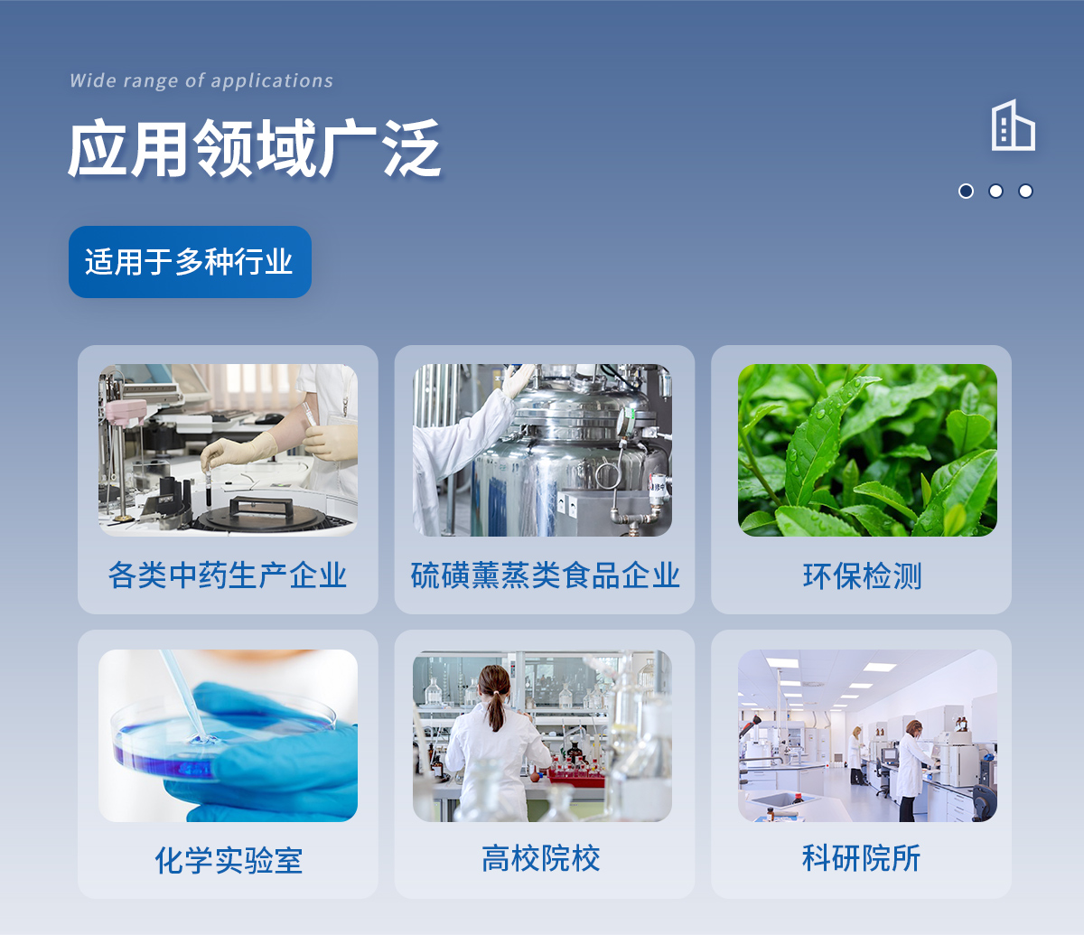 該儀器主要適用各類中藥生產(chǎn)企業(yè),中藥科研院所,以及與硫磺薰蒸相關(guān)的食品生產(chǎn)企業(yè)等,用于常規(guī)二氧化硫殘留量測定。