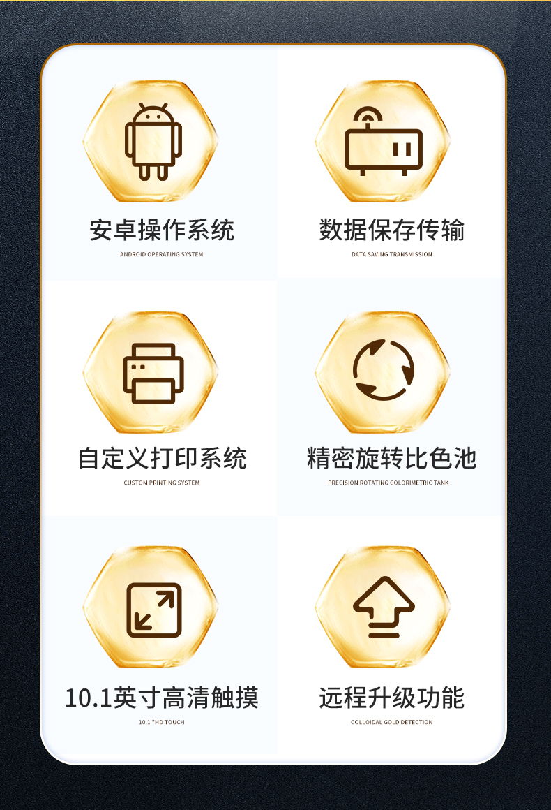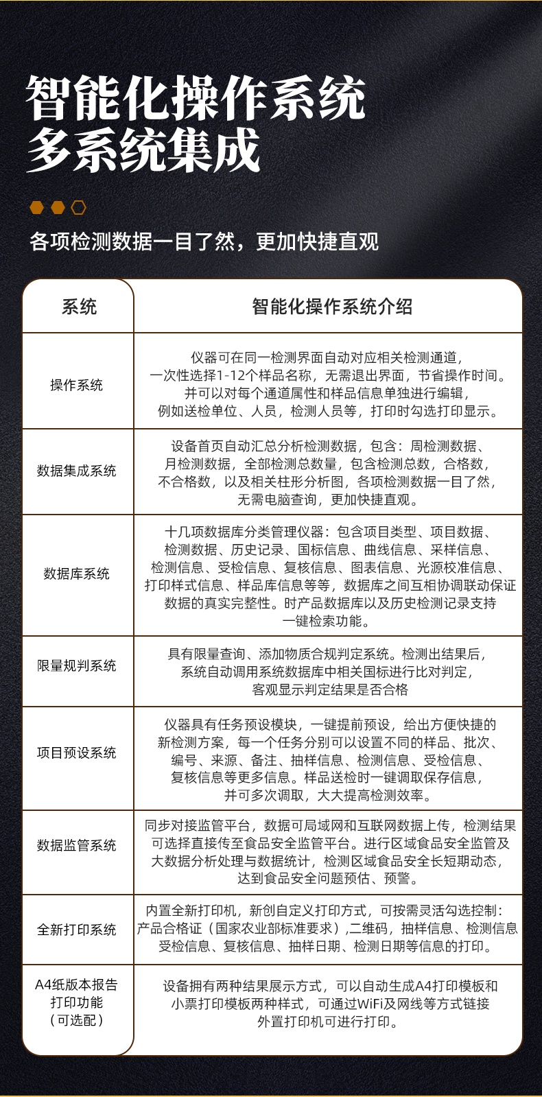 | 儀器采用臺(tái)式一體化系統(tǒng)檢測(cè)技術(shù),將分光光度模塊、膠體金檢測(cè)模塊、新型農(nóng)殘檢測(cè)模塊、數(shù)字化管理模塊、無(wú)線通訊模塊高度集成于一體,支持檢測(cè)200種食品安全檢測(cè)項(xiàng)目,同時(shí)預(yù)留升級(jí)檢測(cè)方法。 | 儀器檢測(cè)模塊標(biāo)準(zhǔn)化、智能化,檢測(cè)項(xiàng)目可隨意自由組合。檢測(cè)箱體內(nèi)置多個(gè)標(biāo)準(zhǔn)檢測(cè)單元,檢測(cè)模塊可以調(diào)整配置。 | 顯示屏幕:儀器采用10.1英寸豎向液晶觸摸屏顯,搭配運(yùn)行安卓智能操作系統(tǒng),主控芯片采用ARM Cortex-A7,RK3288/4核處理器,主頻1.88Ghz,操作方便,性能更強(qiáng)。 | 檢測(cè)通道:≥12通道;采用精密旋轉(zhuǎn)比色池設(shè)計(jì),使用同芯片同光源校準(zhǔn)精度,解決不同光源之間的誤差值,更加準(zhǔn)確**。(1-12通道間誤差0.1%,***:**202022821055.2) | 儀器光源:高精度進(jìn)口四波長(zhǎng)冷光源,每個(gè)通道均配置 410、520、590、630nm 波長(zhǎng)光源,標(biāo)配**的光路切換裝置,專利光路切換功能可實(shí)現(xiàn)64波長(zhǎng),并且所有檢測(cè)項(xiàng)目可實(shí)現(xiàn)所有通道同時(shí)檢測(cè)。 | 設(shè)備可一鍵校準(zhǔn),自動(dòng)保存校準(zhǔn)數(shù)據(jù),自動(dòng)對(duì)比校驗(yàn),得到精準(zhǔn)光源,采用Android SP存儲(chǔ)數(shù)據(jù),光源數(shù)據(jù)永不丟失,方便每一次使用。 | 通訊接口:配備無(wú)線通信模塊、4G(APN)通訊模塊、藍(lán)牙傳輸,同時(shí)具有雙USB接口以及RJ45網(wǎng)線接口,可以多方式實(shí)現(xiàn)數(shù)據(jù)保存及數(shù)據(jù)傳輸 | 存儲(chǔ)方式:支持U盤存儲(chǔ),標(biāo)準(zhǔn)USB接口,免驅(qū)動(dòng)安裝。檢測(cè)結(jié)果存儲(chǔ)容量20萬(wàn)條以上,可生成Excel表格進(jìn)行拷貝,并具有登錄保護(hù)功能。 | 智能化操作系統(tǒng): | 1)操作系統(tǒng):儀器可在同一檢測(cè)界面自動(dòng)對(duì)應(yīng)相關(guān)檢測(cè)通道,一次性選擇1-12個(gè)樣品名稱,無(wú)需退出界面,節(jié)省操作時(shí)間。并可以對(duì)每個(gè)通道屬性和樣品信息單獨(dú)進(jìn)行編輯,例如送檢單位、人員,檢測(cè)人員等,打印時(shí)勾選打印顯示。 | 2)數(shù)據(jù)集成系統(tǒng):設(shè)備首頁(yè)自動(dòng)匯總分析檢測(cè)數(shù)據(jù),包含:周檢測(cè)數(shù)據(jù)、月檢測(cè)數(shù)據(jù),全部檢測(cè)總數(shù)量,均包含檢測(cè)總數(shù),合格數(shù),不合格數(shù),以及相關(guān)柱形分析圖,各項(xiàng)檢測(cè)數(shù)據(jù)一目了然,無(wú)需電腦查詢,更加快捷直觀。 | 3)數(shù)據(jù)庫(kù)系統(tǒng):十幾項(xiàng)數(shù)據(jù)庫(kù)分類管理儀器:包含項(xiàng)目類型、項(xiàng)目數(shù)據(jù)、檢測(cè)數(shù)據(jù)、歷史記錄、國(guó)標(biāo)信息、曲線信息、采樣信息、檢測(cè)信息、受檢信息、復(fù)核信息、圖表信息、光源校準(zhǔn)信息、打印樣式信息、樣品庫(kù)信息等等,數(shù)據(jù)庫(kù)之間互相協(xié)調(diào)聯(lián)動(dòng)保證數(shù)據(jù)的真實(shí)完整性。同時(shí)產(chǎn)品數(shù)據(jù)庫(kù)以及歷史檢測(cè)記錄支持一鍵檢索功能。 | 4)限量規(guī)判系統(tǒng):具有限量查詢、添加物質(zhì)合規(guī)判定系統(tǒng)。檢測(cè)出結(jié)果后,系統(tǒng)自動(dòng)調(diào)用系統(tǒng)數(shù)據(jù)庫(kù)中相關(guān)國(guó)標(biāo)進(jìn)行比對(duì)判定,客觀顯示判定結(jié)果是否合格。 | 5)項(xiàng)目預(yù)設(shè)系統(tǒng):儀器具有任務(wù)預(yù)設(shè)模塊,一鍵提前預(yù)設(shè),給出方便快捷的新檢測(cè)方案,每一個(gè)任務(wù)分別可以設(shè)置不同的樣品、批次、編號(hào)、來(lái)源、備注、抽樣信息、檢測(cè)信息、受檢信息、復(fù)核信息等更多信息。樣品送檢時(shí)一鍵調(diào)取保存信息,并可多次調(diào)取,大大提高檢測(cè)效率。 | 6)數(shù)據(jù)監(jiān)管系統(tǒng):同步對(duì)接監(jiān)管平臺(tái),數(shù)據(jù)可局域網(wǎng)和互聯(lián)網(wǎng)數(shù)據(jù)上傳,檢測(cè)結(jié)果可選擇直接傳至食品安全監(jiān)管平臺(tái)。進(jìn)行區(qū)域食品安全監(jiān)管及大數(shù)據(jù)分析處理與數(shù)據(jù)統(tǒng)計(jì),檢測(cè)區(qū)域食品安全長(zhǎng)短期動(dòng)態(tài),達(dá)到食品安全問(wèn)題預(yù)估、預(yù)警。 | 7)1.全新打印系統(tǒng):內(nèi)置全新打印機(jī),新創(chuàng)自定義打印方式,可按需靈活勾選控制:產(chǎn)品合格證(國(guó)家農(nóng)業(yè)部標(biāo)準(zhǔn)要求),二維碼,抽樣信息、檢測(cè)信息,受檢信息、復(fù)核信息、抽樣日期、檢測(cè)日期等信息的打印。 2.A4紙版本報(bào)告打印功能(可選配):設(shè)備擁有兩種結(jié)果展示方式,可以自動(dòng)生成A4打印模板和小票打印模板兩種樣式,可通過(guò)WiFi及網(wǎng)線等方式鏈接外置打印機(jī)可進(jìn)行打印。 | 供電模式:儀器交直流兩用,直流12V供電,可連接車載電源,可配6ah大容量充電鋰電池,電量可實(shí)時(shí)顯示,方便戶外流動(dòng)測(cè)試。 | 膠體金檢測(cè)模塊:采用雙通道CMOS成像處理技術(shù)及膠體金免疫層析技術(shù),可同時(shí)讀取雙膠體金卡數(shù)據(jù),自動(dòng)采集、處理分析,將檢測(cè)結(jié)果顯示,并可根據(jù)參考限值自動(dòn