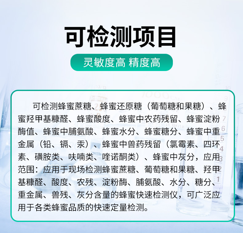 檢測項(xiàng)目:蜂蜜蔗糖、蜂蜜還原糖(葡萄糖和果糖)、蜂蜜羥甲基糠醛、蜂蜜酸度、蜂蜜中農(nóng)藥殘留、蜂蜜淀粉酶值、蜂蜜中脯氨酸、蜂蜜水分、蜂蜜糖分、蜂蜜中重金屬(鉛、鎘、汞)、蜂蜜中抗生素(氯霉素、四環(huán)素、磺胺類、呋喃類、喹諾酮類)、蜂蜜中灰分,可廣泛應(yīng)用于各類蜂蜜品質(zhì)的快速定量檢測。