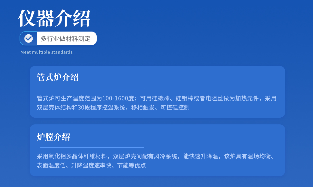 | 1、爐膛采用優(yōu)質(zhì)氧化鋁纖維材料,保溫性能好,耐用,拉伸強(qiáng)度高,無(wú)雜球,純度高,節(jié)能效果明顯; | 2、加熱元件采用優(yōu)質(zhì)HRE電阻絲,大大提高了其使用壽命; | 3、超溫報(bào)警,漏電保護(hù),操作安全可靠。 |