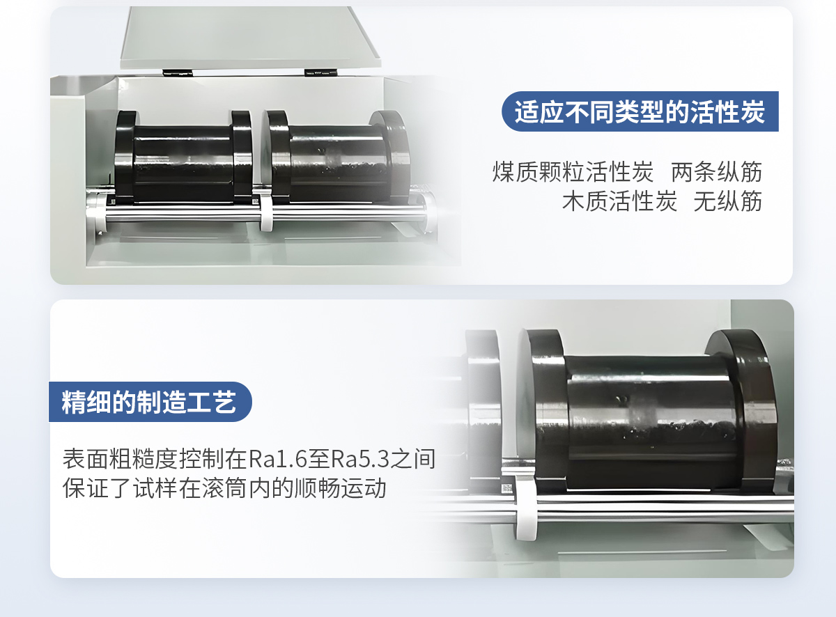 活性炭強度測定儀儀按照規(guī)定的試驗條件,將活性炭試料置于裝有鋼球的滾筒中,開啟強度測定儀,開始計時,通過滾筒的機械運動,試料被磨損,測定被破壞試料粒度的變化情況,用保留在試驗篩上的試料質(zhì)量占原試料的質(zhì)量分?jǐn)?shù),可求出活性炭試樣的強度。