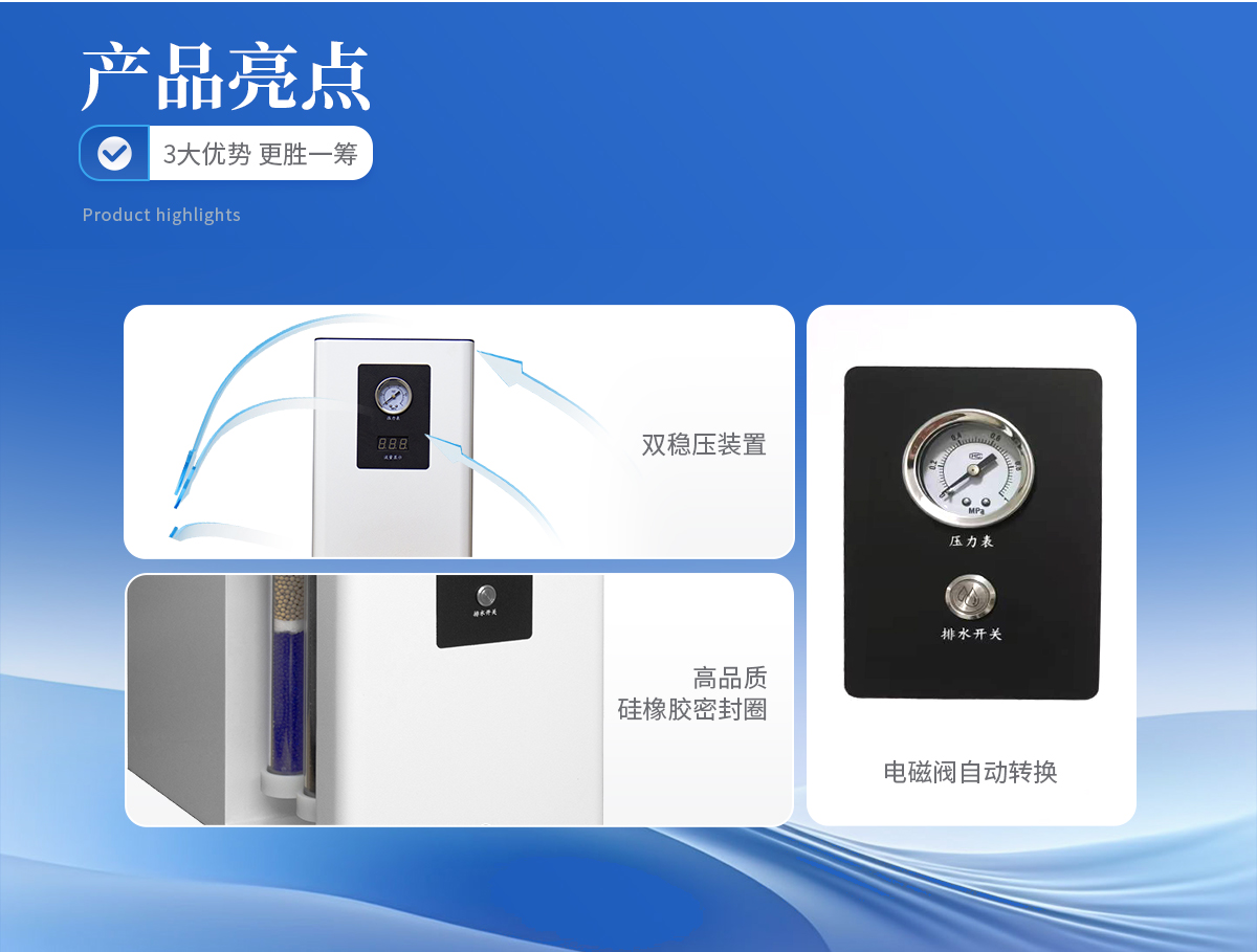 1、雙穩(wěn)壓裝置,確保高精度穩(wěn)壓條件下氣體流量的穩(wěn)定性。 2、電磁閥自動(dòng)轉(zhuǎn)換,徹底杜絕了電磁閥在自動(dòng)放水時(shí)產(chǎn)生的連續(xù)噪音,實(shí)現(xiàn)放水、轉(zhuǎn)換一體化。 3、儀器內(nèi)部采用硅橡膠圈,含硫量低有效提高氣體質(zhì)量,保證色譜基線穩(wěn)定。 4、體積小,雙支FV型亞克力過濾器,耐壓高,不會(huì)因工作環(huán)境及腐蝕氣體的影響,導(dǎo)致過濾管變形,開裂而產(chǎn)生漏氣現(xiàn)象,可持久使用,一勞永逸。