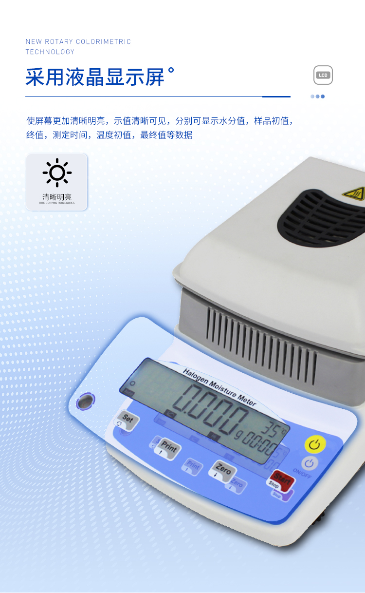 鹵素水分測(cè)定儀是我公司新研制的新型快速水分檢測(cè)儀器。鹵素水分測(cè)定儀采用國(guó)際***的稱重系統(tǒng)【電磁平衡傳感器】。其特點(diǎn)是稱量準(zhǔn)確可靠、顯示快速清晰并且具有自動(dòng)檢測(cè)系統(tǒng)、簡(jiǎn)便的自動(dòng)校準(zhǔn)裝置以及超載保護(hù)等裝置。是一種新型快速的水分檢測(cè)儀器。