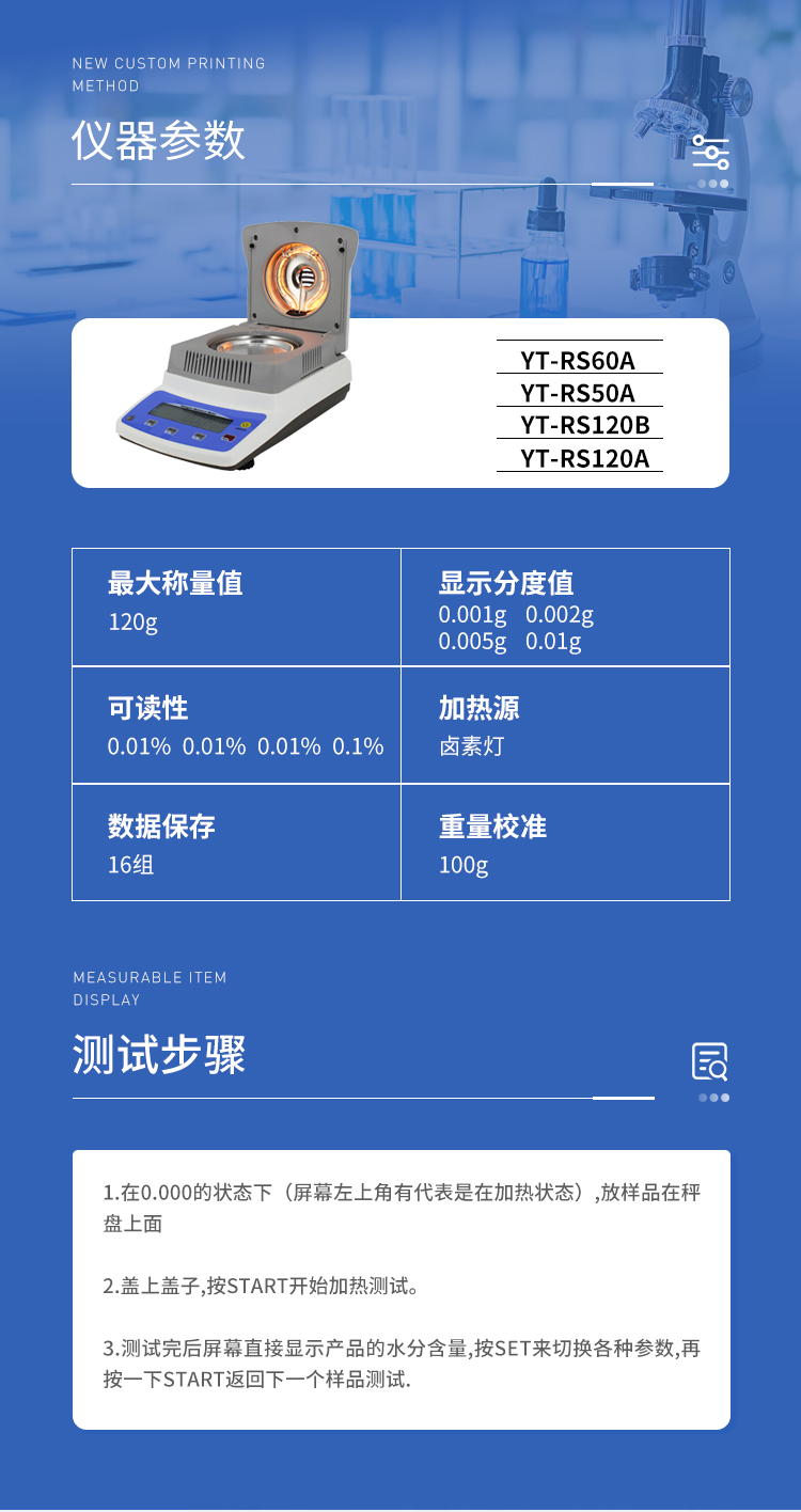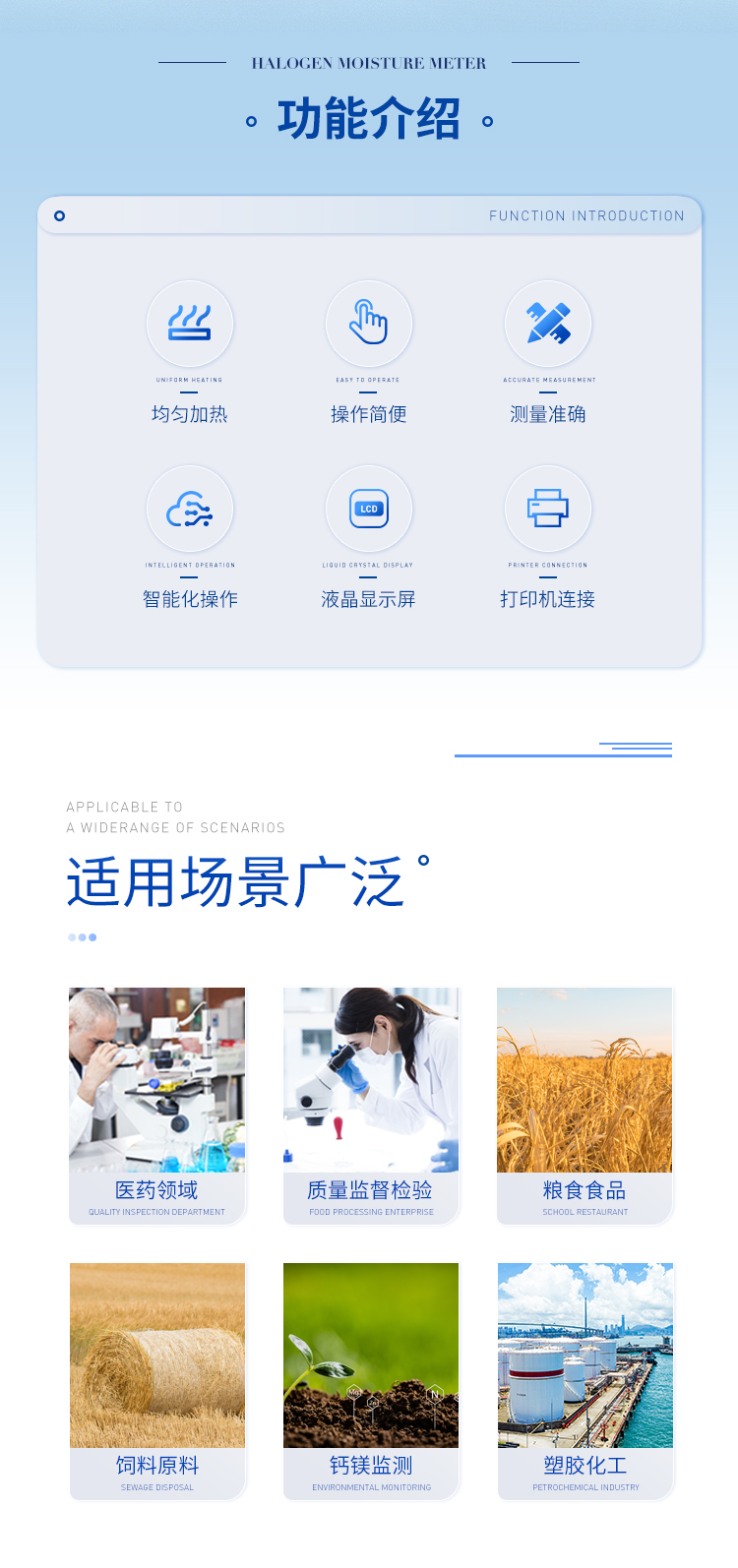 可廣泛應(yīng)用于一切需要快速測(cè)定水分的行業(yè),如醫(yī)藥,糧食、飼料、種子,菜籽,脫水蔬菜、煙草,化工,茶葉,食品、肉類以及紡織,農(nóng)林、造紙、橡膠、塑膠、紡織等行業(yè)中的實(shí)驗(yàn)室與生產(chǎn)過(guò)程中。同時(shí)滿足固體、顆粒、粉末、膠狀體及液體含水率的測(cè)定要求