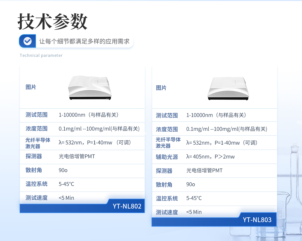 規(guī)格型號(hào):YT-NL803執(zhí)行標(biāo)準(zhǔn):GB/T 19627-2005/ISO 13321-1996 GB/T 29022-2012/ISO 22412-2008測(cè)試范圍 :1-10000nm(與樣品有關(guān))濃度范圍:0.1mg/ml--100mg/ml(與樣品有關(guān))準(zhǔn)確度誤差:<1%(國(guó)家標(biāo)準(zhǔn)樣品D50值)            重復(fù)性誤差:<1%(國(guó)家標(biāo)準(zhǔn)樣品D50值)            激光光源:光纖半導(dǎo)體激光器,λ= 532nm,P=1-40mw(可調(diào)) 輔助激光器,λ= 405nm,P>2mw探測(cè)器:光電倍增管PMT散射角:90o樣品池體積:10mm*10mm*40mm, 1--4mL溫控范圍:5-45℃溫控精度:0.1℃測(cè)試速度:<5 Min            數(shù)字相關(guān)器主要參數(shù):