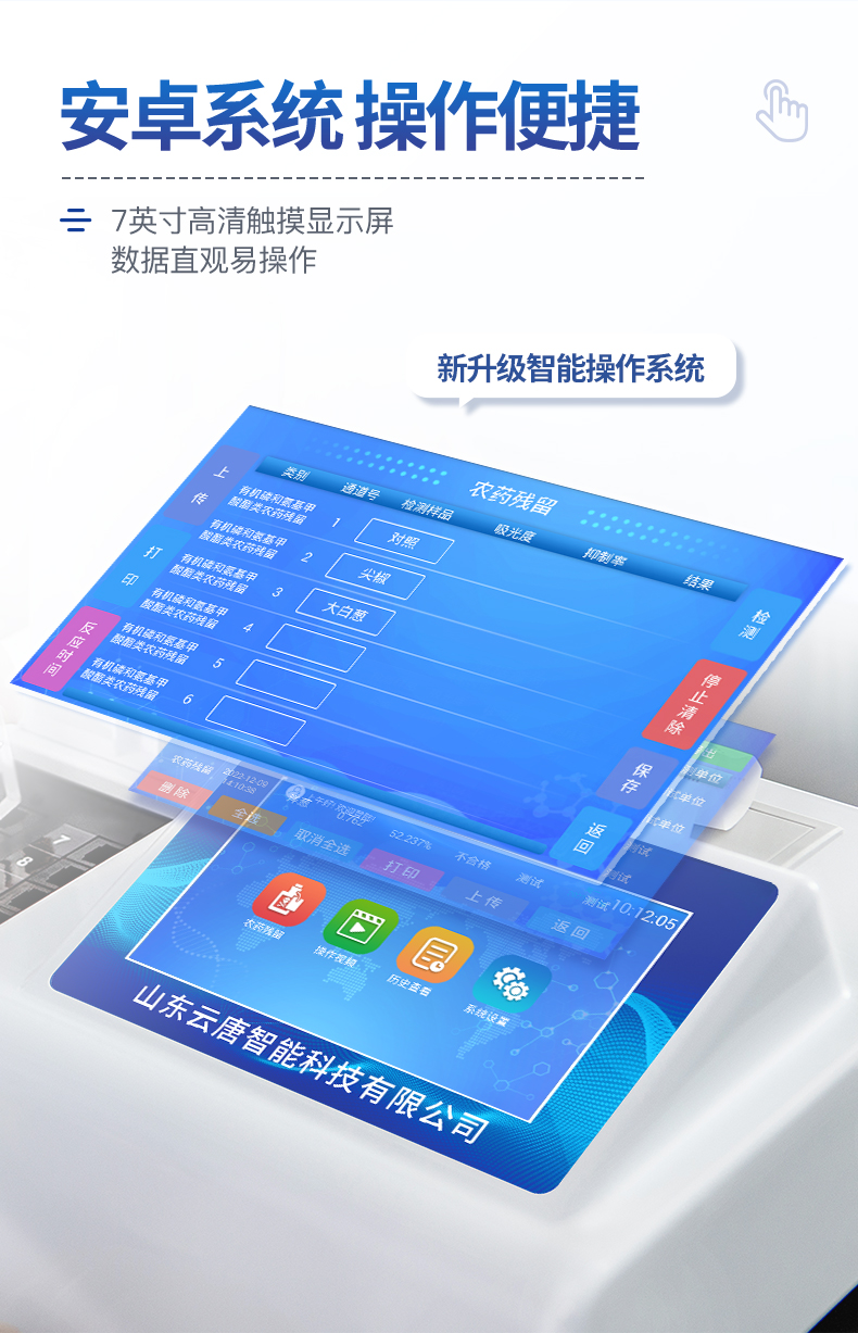 | 乙酰膽堿酯酶和丁酰膽堿酯酶試劑均可以使用,符合國(guó)家標(biāo)準(zhǔn)和農(nóng)業(yè)部標(biāo)準(zhǔn)的要求。 | 自動(dòng)判斷樣品是否合格,檢測(cè)結(jié)果更加直觀(guān)。 | 儀器具有100多種蔬菜名稱(chēng)菜單庫(kù),分類(lèi)管理,并可按需添加或刪除蔬菜名,編輯蔬菜名稱(chēng),可直接打印出蔬菜名稱(chēng)。 | 檢測(cè)通道:20個(gè)檢測(cè)通道,可以同時(shí)測(cè)試多個(gè)樣品,循環(huán)檢測(cè),即放即檢,每個(gè)樣品由程序控制分別獨(dú)立工作,不會(huì)互相干擾。 | 智能操作系統(tǒng),采用更加人性化操作,主控采用多核處理器,主頻1.88Ghz,運(yùn)轉(zhuǎn)速度更快速,穩(wěn)定性更強(qiáng)。 | 顯示方式:7英寸高靈敏真彩觸摸屏顯示,人性化中文操作界面,讀數(shù)直觀(guān)、簡(jiǎn)單。 | 打印機(jī)采用串口5v打印,可選擇手動(dòng)打印或者自動(dòng)打印,三分鐘出打印結(jié)果,打印格式為檢測(cè)人姓名、吸光度差值、檢測(cè)時(shí)間、檢測(cè)機(jī)構(gòu)、樣品名稱(chēng)及結(jié)果判定。 | 光源采用進(jìn)口超高亮發(fā)光二極管,具有低功耗、高精度、穩(wěn)定性強(qiáng)、光源可控可以關(guān)掉不使用的光源,響應(yīng)速度快等優(yōu)點(diǎn)。 | 智能恒流穩(wěn)壓,光強(qiáng)自動(dòng)校準(zhǔn),長(zhǎng)時(shí)間連續(xù)工作光源無(wú)溫漂現(xiàn)象。 | 儀器具有GPRS遠(yuǎn)傳功能,可插手機(jī)卡實(shí)現(xiàn)數(shù)據(jù)遠(yuǎn)傳平臺(tái),wifi聯(lián)網(wǎng)功能,可將數(shù)據(jù)快速上傳電腦,進(jìn)行數(shù)據(jù)管理與統(tǒng)計(jì)。 | 采用USB2.0接口設(shè)計(jì),方便數(shù)據(jù)的存貯和移動(dòng),并可隨時(shí)與計(jì)算機(jī)直接相連,并且可用計(jì)算機(jī)控制儀器。實(shí)現(xiàn)數(shù)據(jù)查詢(xún)、瀏覽、分析、統(tǒng)計(jì)、打印等。 | 智能化程度高,儀器具有自檢功能:具有開(kāi)機(jī)自檢和調(diào)零功能,具有自動(dòng)檢測(cè)重復(fù)性功能 | 儀器具有自身保護(hù)功能,可設(shè)置用戶(hù)名及密碼,防止非工作人員操作等。 | 采用DC12v直流供電,安全系統(tǒng)更高,并且配備6A鋰電池充電器。 | 儀器具有重新校準(zhǔn)、鎖定、恢復(fù)出廠(chǎng)設(shè)置功能。 |