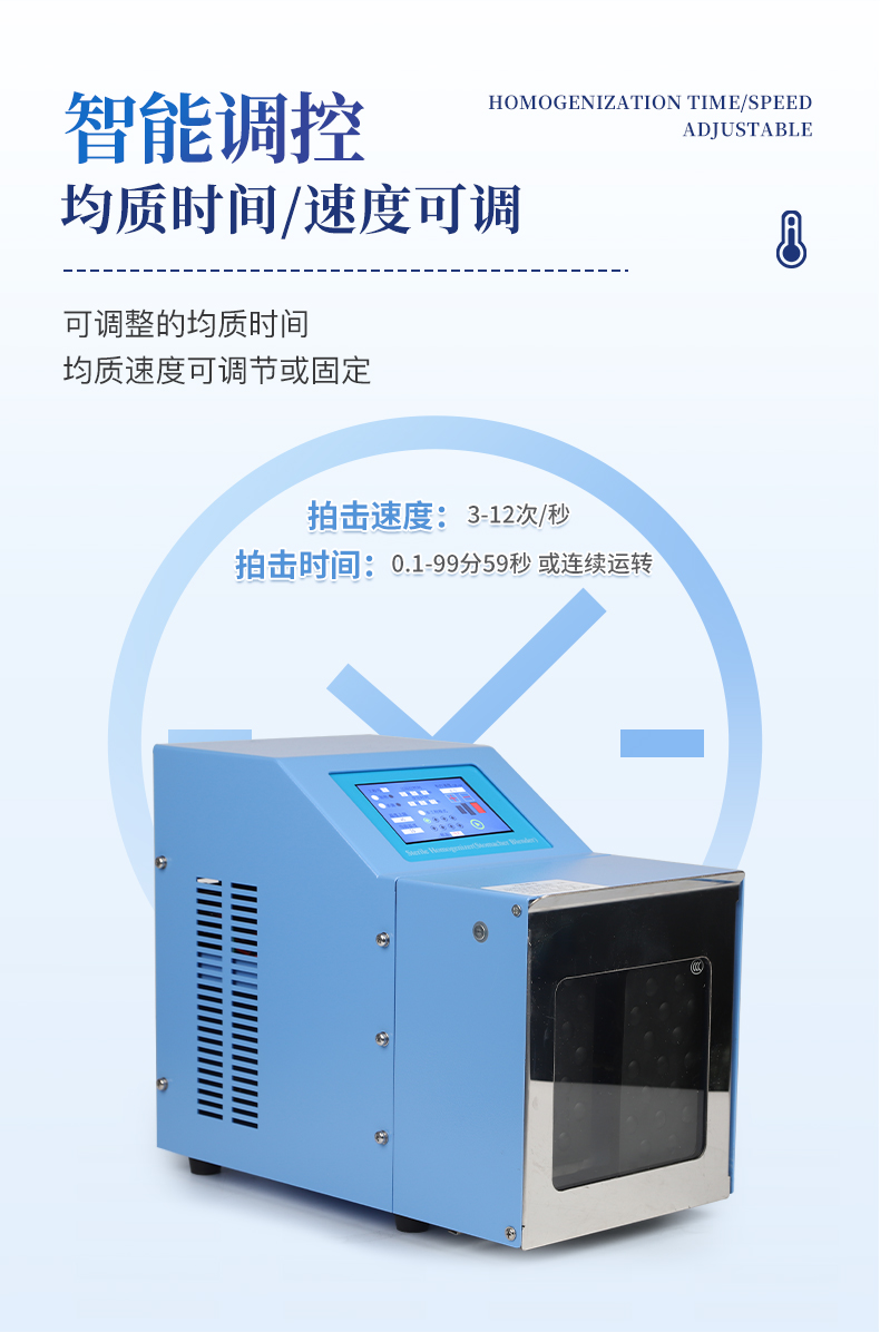 ●5英寸液晶顯示屏。    ●可儲存三組工作程序。    ●可調(diào)整的均質(zhì)時間。    ●均質(zhì)速度可調(diào)節(jié)或固定。    ●拍擊器可調(diào)整前后距離。    ●無菌一次性濾袋,保證衛(wèi)生。    ●全開啟式門,易于清洗。    ●玻璃透明窗口易于觀察 。    ●樣品與均質(zhì)儀無接觸,如無樣品泄露則不需進行系統(tǒng)清洗.    ●均質(zhì)柔和、樣品零污染、無損傷、不升溫、不需要滅菌處理,不需洗刷器皿。