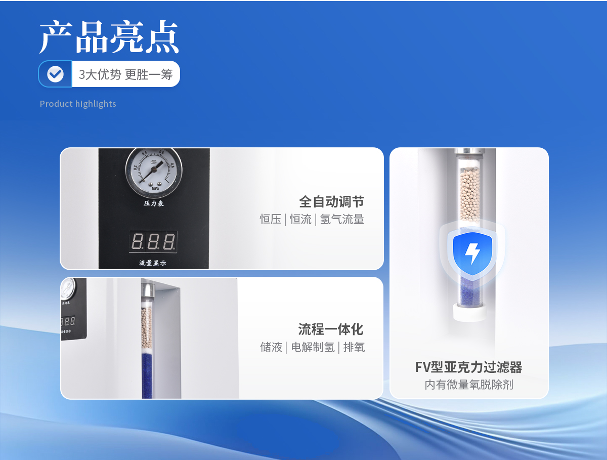 1、壓力、流量自動(dòng)顯示,自動(dòng)恒壓、恒流、氫氣流量可根據(jù)用量實(shí)現(xiàn)全自動(dòng)調(diào)節(jié)。 2、FV型亞克力過(guò)濾器,內(nèi)有微量氧脫除劑(不需要活化),氫氣純度更高;儀器內(nèi)部采用硅橡膠圈(含硫量低),有效提高氣體質(zhì)量,保證色譜基線平穩(wěn)。 3、儲(chǔ)液、電解制氫、排氧一體化,池溫低,壽命長(zhǎng)久。 4、配有安全裝置,靈敏可靠,自動(dòng)防返堿。