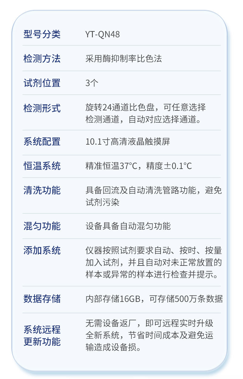 1. 試劑位置:3個(gè)2. 檢測(cè)形式:旋轉(zhuǎn)48通道比色盤,可任意選擇檢測(cè)通道,自動(dòng)對(duì)應(yīng)選擇通道。3. 系統(tǒng)配置:10.1寸高清液晶觸摸屏,采用ARM Cortex-A7,RK3288/4核處理器,運(yùn)行內(nèi)存1GB。Android7.1.1 系統(tǒng)分辨率1280×800。4.恒溫系統(tǒng):具有自動(dòng)加溫溫控系統(tǒng),精準(zhǔn)恒溫37℃,精度±0.1℃。5.添加系統(tǒng):儀器按照試劑要求自動(dòng)、按時(shí)、按量加入試劑,并且自動(dòng)對(duì)未正常放置的樣本或異常的樣本進(jìn)行檢查并提示。 6.清洗功能:儀器具備回流及自動(dòng)清洗管路功能,避免試劑污染。7.混勻功能:設(shè)備具備自動(dòng)混勻功能。8.光源校準(zhǔn):設(shè)備可自動(dòng)校準(zhǔn),確保檢測(cè)準(zhǔn)確度。9.實(shí)時(shí)監(jiān)控:儀器測(cè)試過程中屏幕顯示運(yùn)行狀態(tài),可實(shí)時(shí)查看。10.數(shù)據(jù)存儲(chǔ):內(nèi)部存儲(chǔ)16GB,可存儲(chǔ)500萬條數(shù)據(jù)。11.樣品多選功能:設(shè)備具備樣品一鍵多選功能,選擇樣品自動(dòng)匹配檢測(cè)通道。12.項(xiàng)目預(yù)設(shè):可提前設(shè)置單個(gè)及多個(gè)相同或不相同的檢測(cè)任務(wù),可單次或者多次調(diào)取,減少檢測(cè)時(shí)間。13.自定義打印系統(tǒng):內(nèi)置自定義打印系統(tǒng),可按需靈活設(shè)置開啟或關(guān)閉:產(chǎn)品合格證(國(guó)家農(nóng)業(yè)部標(biāo)準(zhǔn)),二維碼,抽樣信息、檢測(cè)信息,受檢信息等信息的打印。14.A4版本報(bào)告打印功能:設(shè)備可自動(dòng)生成A4版報(bào)告,A4報(bào)告帶二維碼,可掃描二維碼生成電子版,并可識(shí)別真?zhèn)巍?/td>15.傳輸方式:儀器配備無線通信模塊: 4G(APN)通訊模塊、Wifi模塊,藍(lán)牙傳輸模塊,同時(shí)具有USB接口以及RJ45接口能以多種方式實(shí)現(xiàn)數(shù)據(jù)保存和數(shù)據(jù)傳輸功能,設(shè)備數(shù)據(jù)可以同步上傳至平臺(tái)。16.數(shù)據(jù)監(jiān)管系統(tǒng):設(shè)備自帶監(jiān)管平臺(tái),并可同步對(duì)接監(jiān)管平臺(tái),數(shù)據(jù)可局域網(wǎng)和互聯(lián)網(wǎng)數(shù)據(jù)上傳,檢測(cè)結(jié)果可直接傳至食品安全監(jiān)管平臺(tái)。達(dá)到食品安全問題預(yù)估、預(yù)警。17.系統(tǒng)遠(yuǎn)程更新功能:無需設(shè)備返廠,即可遠(yuǎn)程實(shí)時(shí)升級(jí)全新系統(tǒng),節(jié)省時(shí)間成本及避免運(yùn)輸造成設(shè)備損。