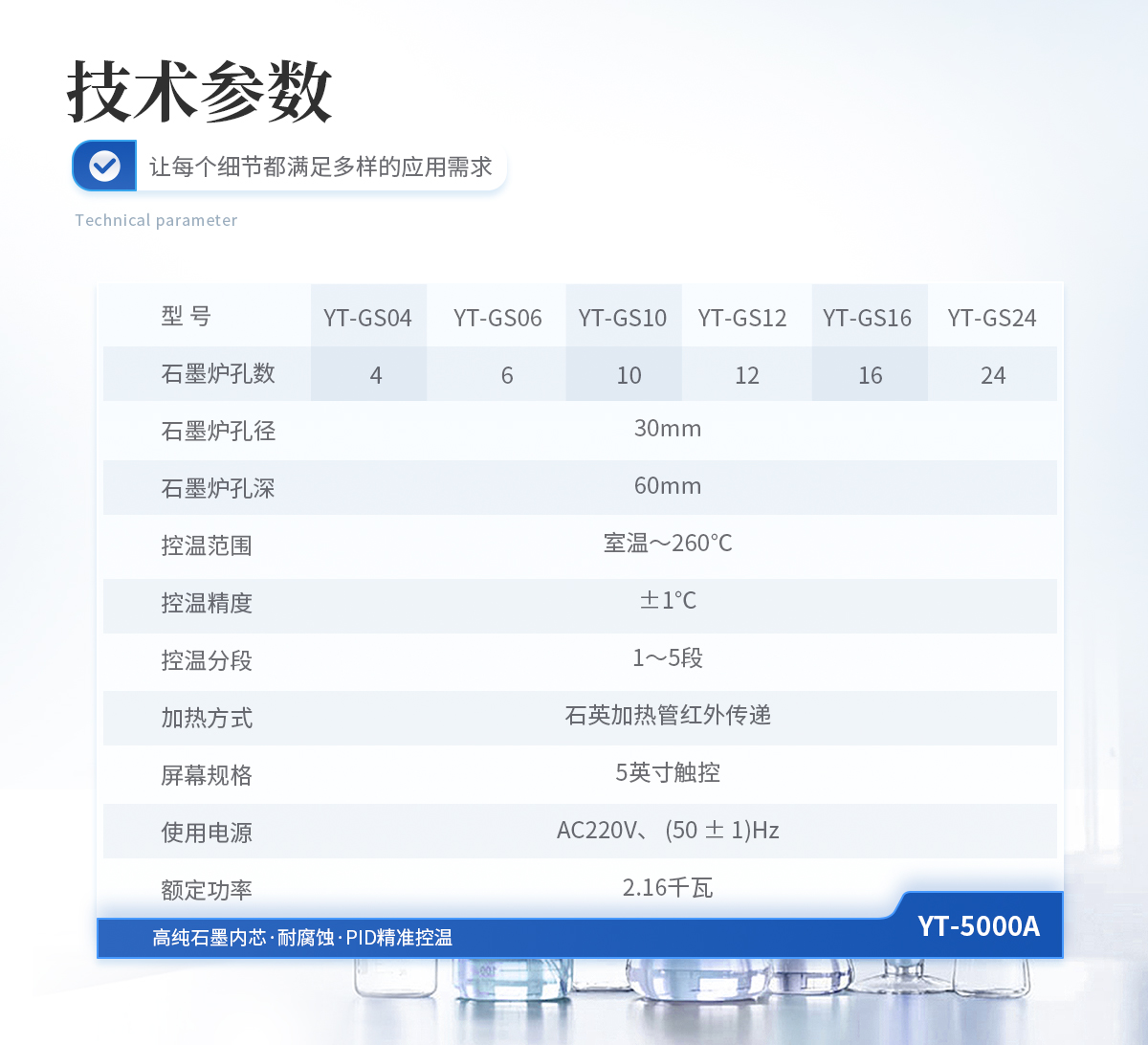 石墨爐孔:孔徑30mm,孔深60mm,孔數(shù)4×3    控溫范圍:室溫~260℃    控溫精度:±1℃    控溫分段:1~5段    加熱方式:石英加熱管紅外傳遞    屏幕規(guī)格:5寸觸控    主機(jī)外型尺寸:寬477mm×深460mm×高168mm    使用電源:AC220V、 (50 ± 1)Hz    額定功率:1.62千瓦