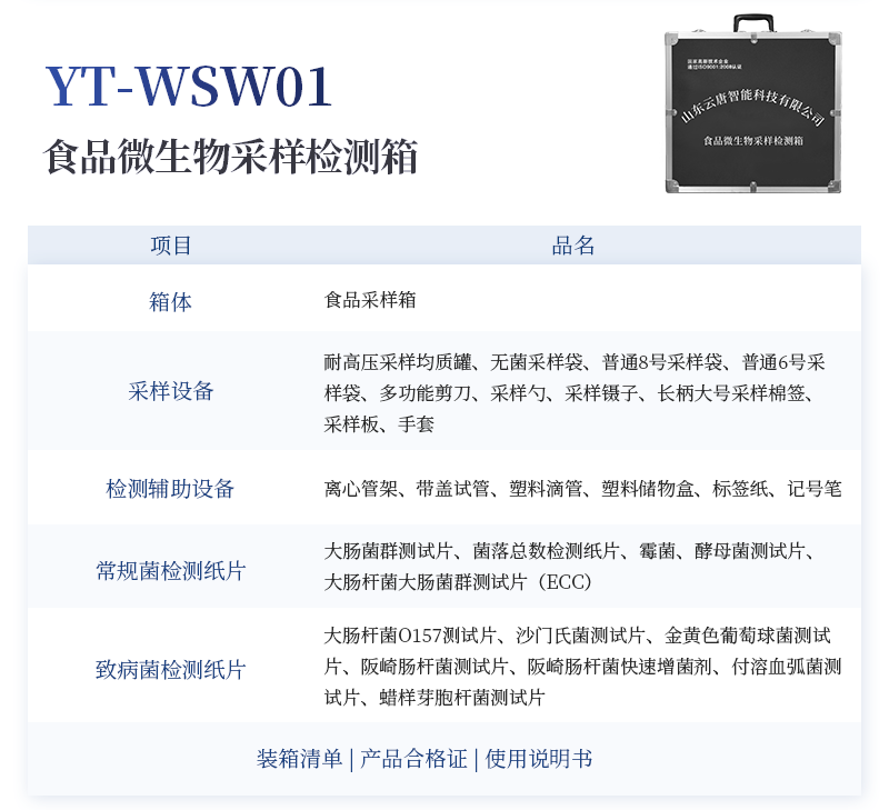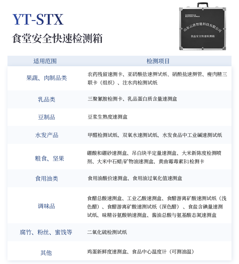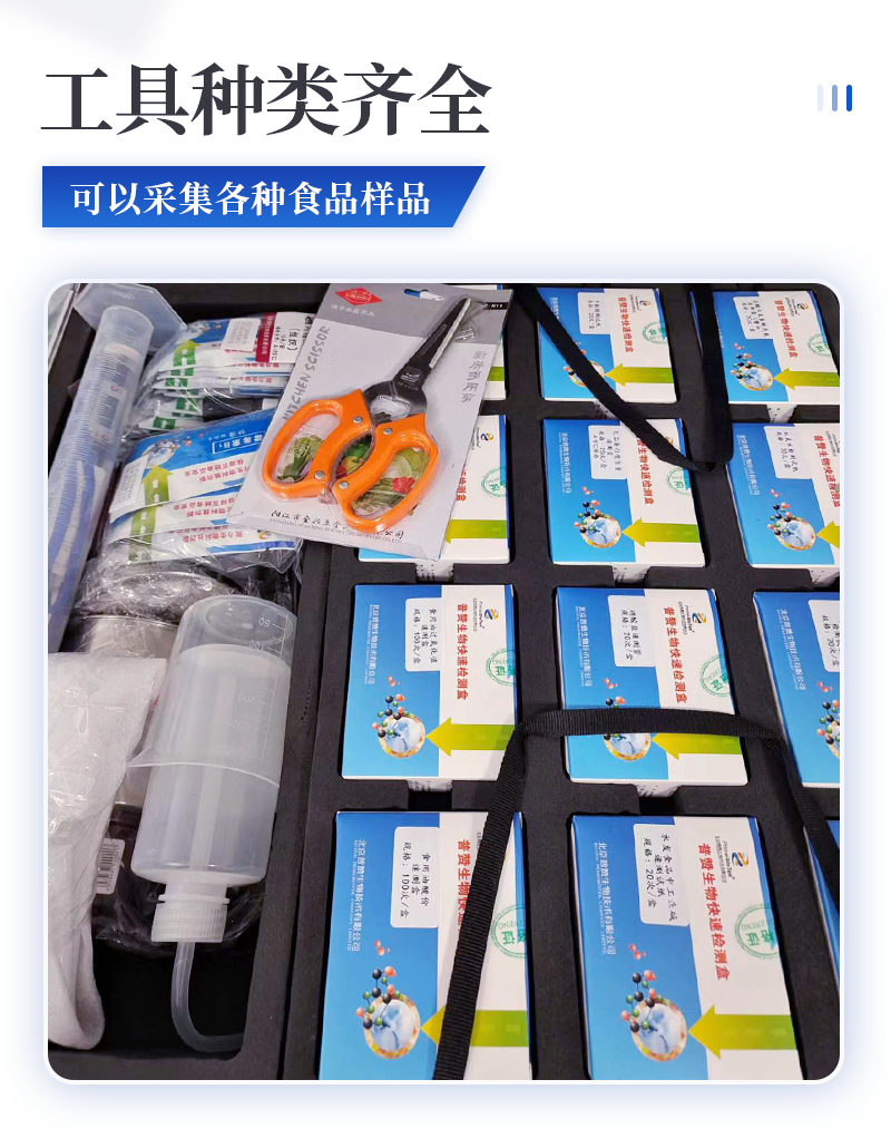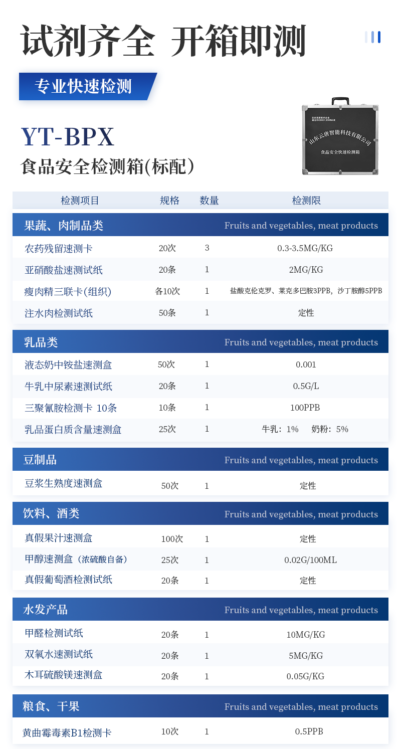 急性中毒快速檢測箱標(biāo)配箱 序號適用范圍檢測項目規(guī)格單位數(shù)量檢測限檢測范圍1果蔬、肉制品類便攜式農(nóng)藥殘留快速檢測儀12通道臺1//農(nóng)藥殘留速測卡20次盒30.3-3.5mg/kg/亞硝酸鹽速測試紙20條套12mg/kg0-40mg/kg砷速測盒30次盒1砷:2mg/kg /汞速測盒30次盒1 汞:20mg/kg/瘦肉精三聯(lián)卡(組織)各10次包2鹽酸克倫克羅、萊克多巴胺3ppb,沙丁胺醇5ppb/2豆制品 奶制品液態(tài)奶新鮮度速測盒20次盒10.60T/豆?jié){生熟度速測盒 50次盒1定性/3飲料、酒類甲醇速測盒(濃硫酸自備) 25次盒10.02g/100mL0-0.32g/100mL4糧食、干果黃曲霉毒素B1檢測卡10次包10.5ppb/5食用油類食用油酸價速測盒100次盒11mg/kg0-8mg/kg食用油過氧化值速測盒100次盒10.09g/100g0.09-0.45g/100g6食物及水中毒物殘留毒鼠強速測盒(乙酸乙酯自備)10次盒12mg/kg/敵鼠鈉鹽速測盒100次盒1100mg/kg/氰化物檢測試紙20條套11mg/L0-10mg/L氟乙酰胺速測盒30次盒150mg/kg/硼酸和硼砂速測盒100次盒125mg/kg定性鼠藥安妥檢測試紙 40次包10.02mg/g,mL/鼠藥磷化鋅速測盒10次包120mg/kg/7箱體預(yù)裝輔助設(shè)備急性中毒箱箱體便攜式個1//便攜水浴鍋功率300W個1多功能剪刀-把1計算器-個1洗瓶250ml個1塑料滴管3ml根10塑料滴管0.2ml根50樣品管架10ml個1天平0.1-200g個1移液器1mL支1玻璃三角瓶100ml個2玻璃樣品管10ml個2小離心管1.5ml個24塑料樣品管10ml個10樣品瓶50ml個2離心管架1.5ml個1燒杯250ml個1量筒100ml個1手套-包1計時器-個1槍頭1ml個20組織提取器便攜式個1錫箔紙10張/包包1裝箱清單-份1產(chǎn)品合格證-份1使用說明書-份1 |