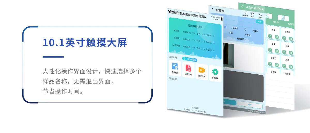 | 儀器采用手提式一體化系統(tǒng)檢測技術(shù),將分光光度模塊、膠體金檢測模塊、新型農(nóng)殘檢測模塊、數(shù)字化管理模塊、無線通訊模塊高度集成于一體,支持檢測200種食品安全檢測項目,同時預(yù)留升級檢測方法。 | 儀器檢測模塊標(biāo)準(zhǔn)化、智能化,檢測項目可隨意自由組合。檢測箱體內(nèi)置多個標(biāo)準(zhǔn)檢測單元,檢測模塊可以調(diào)整配置。 | 顯示屏幕:儀器采用10.1英寸豎向液晶觸摸屏顯,搭配運行安卓智能操作系統(tǒng),主控芯片采用ARM Cortex-A7,RK3288/4核處理器,主頻1.88Ghz,操作方便,性能更強(qiáng)。 | 檢測通道:≥12通道;采用精密旋轉(zhuǎn)比色池設(shè)計,使用同芯片同光源校準(zhǔn)精度,解決不同光源之間的誤差值,更加準(zhǔn)確**。(1-12通道間誤差0.1%,***:**202022821055.2) | 儀器光源:高精度進(jìn)口四波長冷光源,每個通道均配置 410、520、590、630nm 波長光源,標(biāo)配**的光路切換裝置,專利光路切換功能可實現(xiàn)64波長,并且所有檢測項目可實現(xiàn)所有通道同時檢測。 | 設(shè)備可一鍵校準(zhǔn),自動保存校準(zhǔn)數(shù)據(jù),自動對比校驗,得到精準(zhǔn)光源,采用Android SP存儲數(shù)據(jù),光源數(shù)據(jù)永不丟失,方便每一次使用。 | 通訊接口:配備無線通信模塊、4G(APN)通訊模塊、藍(lán)牙傳輸,同時具有雙USB接口以及RJ45網(wǎng)線接口,可以多方式實現(xiàn)數(shù)據(jù)保存及數(shù)據(jù)傳輸。 | 存儲方式:支持U盤存儲,標(biāo)準(zhǔn)USB接口,免驅(qū)動安裝。檢測結(jié)果存儲容量20萬條以上,可生成Excel表格進(jìn)行拷貝,并具有登錄保護(hù)功能。 | 智能化操作系統(tǒng):: ★操作系統(tǒng):儀器可在同一檢測界面自動對應(yīng)相關(guān)檢測通道,一次性選擇1-12個樣品名稱,無需退出界面,節(jié)省操作時間。并可以對每個通道屬性和樣品信息單獨進(jìn)行編輯,例如送檢單位、人員,檢測人員等,打印時勾選打印顯示。 | ★數(shù)據(jù)集成系統(tǒng):設(shè)備首頁自動匯總分析檢測數(shù)據(jù),包含:周檢測數(shù)據(jù)、月檢測數(shù)據(jù),全部檢測總數(shù)量,均包含檢測總數(shù),合格數(shù),不合格數(shù),以及相關(guān)柱形分析圖,各項檢測數(shù)據(jù)一目了然,無需電腦查詢,更加快捷直觀。 | ★數(shù)據(jù)庫系統(tǒng):十幾項數(shù)據(jù)庫分類管理儀器:包含項目類型、項目數(shù)據(jù)、檢測數(shù)據(jù)、歷史記錄、國標(biāo)信息、曲線信息、采樣信息、檢測信息、受檢信息、復(fù)核信息、圖表信息、光源校準(zhǔn)信息、打印樣式信息、樣品庫信息等等,數(shù)據(jù)庫之間互相協(xié)調(diào)聯(lián)動保證數(shù)據(jù)的真實完整性。同時產(chǎn)品數(shù)據(jù)庫以及歷史檢測記錄支持一鍵檢索功能。 | ★限量規(guī)判系統(tǒng):具有限量查詢、添加物質(zhì)合規(guī)判定系統(tǒng)。檢測出結(jié)果后,系統(tǒng)自動調(diào)用系統(tǒng)數(shù)據(jù)庫中相關(guān)國標(biāo)進(jìn)行比對判定,客觀顯示判定結(jié)果是否合格 | ★項目預(yù)設(shè)系統(tǒng):儀器具有任務(wù)預(yù)設(shè)模塊,一鍵提前預(yù)設(shè),給出方便快捷的新檢測方案,每一個任務(wù)分別可以設(shè)置不同的樣品、批次、編號、來源、備注、抽樣信息、檢測信息、受檢信息、復(fù)核信息等更多信息。樣品送檢時一鍵調(diào)取保存信息,并可多次調(diào)取,大大提高檢測效率。 | ★數(shù)據(jù)監(jiān)管系統(tǒng):同步對接監(jiān)管平臺,數(shù)據(jù)可局域網(wǎng)和互聯(lián)網(wǎng)數(shù)據(jù)上傳,檢測結(jié)果可選擇直接傳至食品安全監(jiān)管平臺。進(jìn)行區(qū)域食品安全監(jiān)管及大數(shù)據(jù)分析處理與數(shù)據(jù)統(tǒng)計,檢測區(qū)域食品安全長短期動態(tài),達(dá)到食品安全問題預(yù)估、預(yù)警。 | ★打印系統(tǒng):內(nèi)置全新打印機(jī),新創(chuàng)自定義打印方式,可按需靈活勾選控制:產(chǎn)品合格證(國家農(nóng)業(yè)部標(biāo)準(zhǔn)要求),二維碼,抽樣信息、檢測信息,受檢信息、復(fù)核信息、抽樣日期、檢測日期等信息的打印。 | 供電模式:儀器交直流兩用,直流12V供電,可連接車載電源,可配6ah大容量充電鋰電池,電量可實時顯示,方便戶外流動測試。 | 膠體金檢測模塊:采用雙通道CMOS成像處理技術(shù)及膠體金免疫層析技術(shù),可同時讀取雙膠體金卡數(shù)據(jù),自動采集、處理分析,將檢測結(jié)果顯示,并可根據(jù)參考限值自動判斷檢測結(jié)果,可檢測常見的獸藥殘留、生物毒素、抗生素、違禁添加物等。 | ★探測技術(shù):CMOS成像探測; | ★檢測通道:1個通道; | ★檢測方式:消線法和比色法; | ★顯示模式:陰性或陽性; | ★曲線形式:軌道式掃描方式,顯示金標(biāo)卡圖像,實時生成、識別CT曲線圖,無需手動調(diào)整,完成檢測后自動退出檢測卡。兼容市場上其他金標(biāo)卡,使用耗材不受限制。 | 儀器加入遠(yuǎn)程升級功能,可定向分客戶分儀器更新,開機(jī)后自動更新,客戶無需任何操作,即可升級全新項目。做到了無需退換機(jī)器即可實現(xiàn)實時遠(yuǎn)程升級檢測儀器。 |