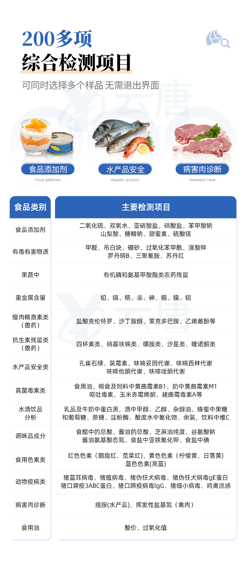 食品添加劑:二氧化硫、雙氧水、亞硝酸鹽、硝酸鹽、苯甲酸鈉、山梨酸鉀、糖精鈉、甜蜜素、木耳硫酸鎂等有毒有害物質(zhì):甲醛、吊白塊、硼砂、過氧化苯甲酰、溴酸鉀、羅丹明B、三聚氰胺、蘇丹紅、工業(yè)堿、尿素、明礬等果蔬:農(nóng)藥殘留(酶抑制率法)病害肉診斷:組胺、揮發(fā)性鹽基氮;重金屬含量:鉛、鎘、鉻、汞、砷、錫、鎳、鋁等;食用油脂: 過氧化值、酸價(jià)等瘦肉精激素類(獸藥):鹽酸克倫特羅、沙丁胺醇、萊克多巴胺、己烯雌酚等抗生素殘留類(獸藥):四環(huán)素類、硝基呋喃類、磺胺類、β-興奮劑類、沙星類、磺胺類、喹諾酮類,甲砜霉素,氟苯尼考,金剛烷胺、替米考星、慶大霉素、林可霉素、鏈霉素、恩諾沙星、環(huán)丙沙星、頭孢啦啶、青霉素、阿莫西林等真菌毒素類:食用油、糧食及飼料中黃曲霉毒素B1、黃曲霉毒素總量,奶中黃曲霉毒素M1、嘔吐毒素、玉米赤霉烯酮、赭曲霉毒素A、T2毒素、伏馬毒素等;水酒飲品分析:酒中甲醇、乙醇、乳品及牛奶中蛋白質(zhì),調(diào)味品成分:食醋的總酸、醬油的總酸、芝麻油純度、谷氨酸鈉、醬油氨基酸態(tài)氮、食鹽中亞鐵氰化鉀、食鹽中碘等食用色素類:紅色色素(胭脂紅、莧菜紅、赤蘚紅、誘惑紅)、黃色色素(檸檬黃、日落黃)、藍(lán)色色素(亮藍(lán))等動(dòng)物疫病類:禽流感、新城疫、牛羊口蹄疫、牛羊結(jié)核病、牛羊包蟲、牛羊布病、小反芻獸、豬藍(lán)耳病毒、豬瘟病毒、豬偽狂犬病毒、豬細(xì)小、豬圓環(huán)、犬細(xì)小病毒、犬瘟熱病毒、犬狂犬病毒等;蜂蜜成分:果糖和葡萄糖、蔗糖、淀粉酶、酸度等水產(chǎn)品安全類:孔雀石綠、氯霉素、呋喃妥因、呋喃西林、呋喃它酮、呋喃唑酮等蛋類藥物殘留:氯霉素,四環(huán)素,磺胺類,喹諾酮類,呋喃西林,呋喃它酮,呋喃妥因,呋喃唑酮,氟苯尼考,阿莫西林、頭孢氨芐、紅霉素、鏈霉素等